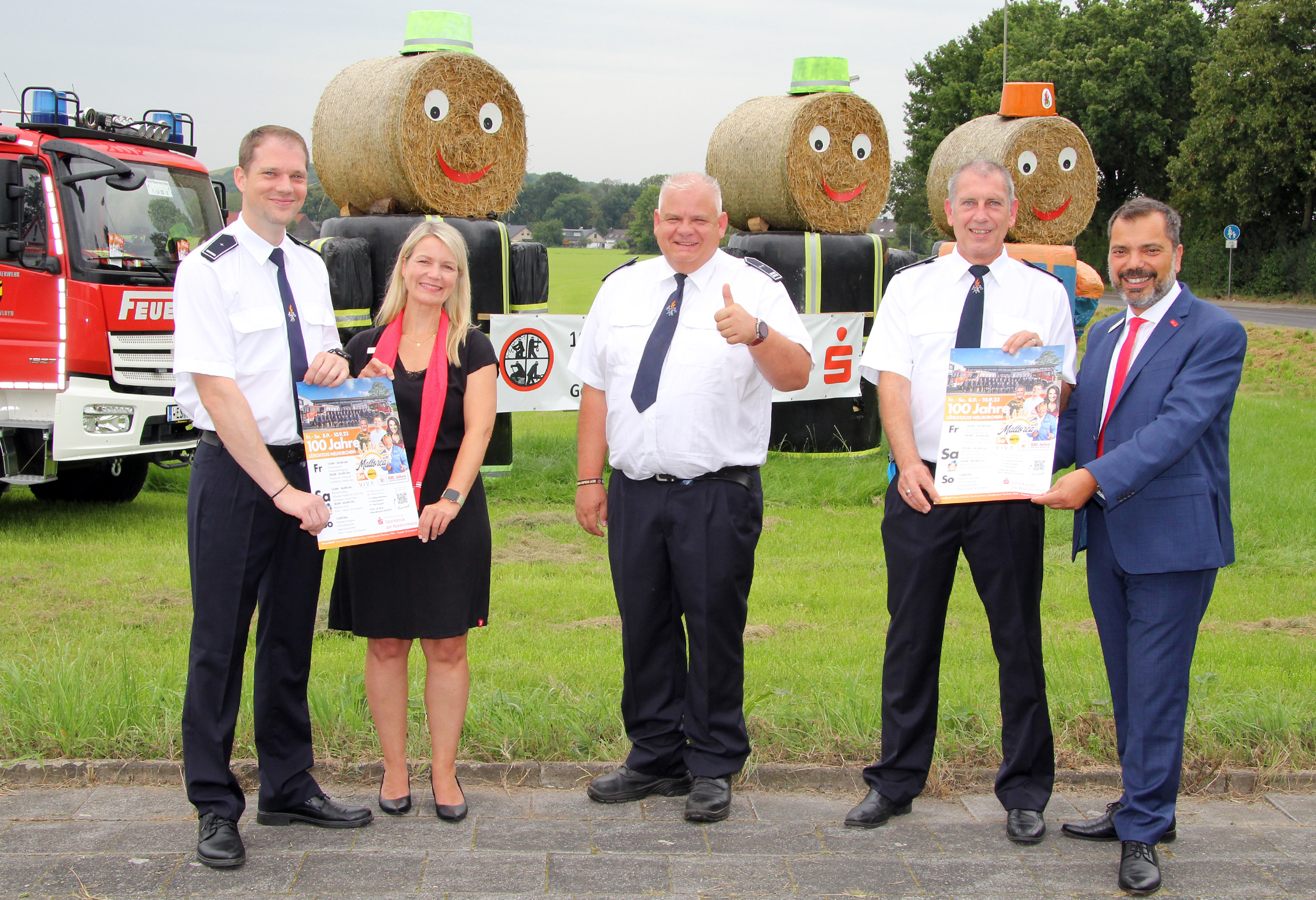 NEUKIRCHEN-VLUYN. Die Vorbereitungen für das Festwochenende vom 8. bis 10. September zum 100-jährigen Bestehen des Löschzugs Neukirchen laufen auf Hochtouren. Was die Feuerwehrleute besonders freut: „Der Kartenvorverkauf für die Mallorca-Party am Samstag im Viva-Eventpark übertrifft unsere Erwartungen.“ Noch gebe es Tickets bei Giesen-Handick, Reisebüro Horn, Schreibwaren Teschner und Viva, sagt Einheitenführer Klaus Kutsch, doch die würden langsam knapp, zumal jetzt auch die Sparkasse an der Poststraße zur Vorverkaufsstelle geworden sei. „Wer weiß, ob es überhaupt noch Karten an der Abendkasse geben wird“, sagt Brandinspektor David Schade. Zusammen mit dem Vorstandsvorsitzenden Giovanni Malaponti und Geschäftsstellenleiterin Katrin Steffans vom Hauptsponsor Sparkasse am Niederrhein stellten die Wehrleute das dreitägige Festprogramm vor.