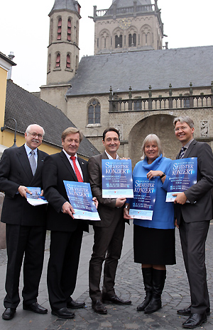 Das Silvesterkonzert im Xantener Dom wird das Jahr feierlich und musikalisch hochkarätig beschließen, versprechen Peter Friese von der Tourist Information Xanten, Sparkassendirektor Bernhard Uppenkamp, der künstlerische Koordinator Dirk Wittfeld, Sabine van der List und Bürgermeister Christian Strunk (v.l.n.r.).