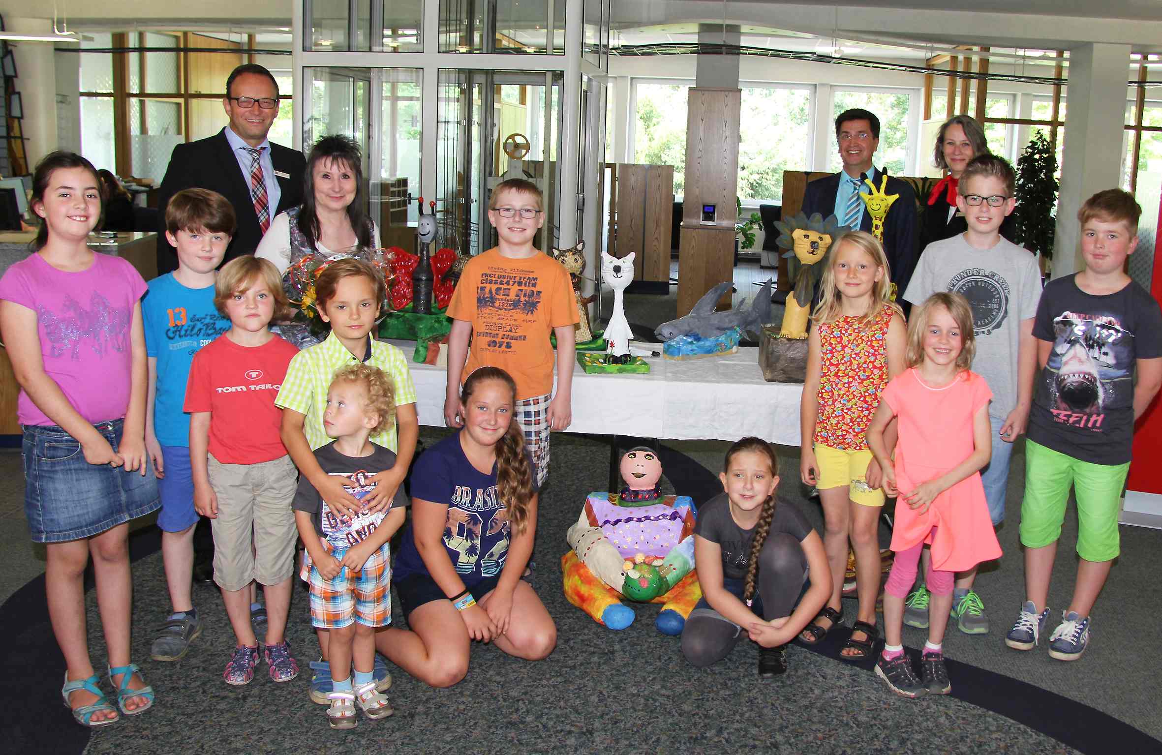 RHEINBERG. 13 Tierfiguren und eine freundliche Frauengestalt schmücken noch bis zum 7. September die Kundenhalle der Sparkasse an der Bahnhofstraße. Gefertigt wurden die bunten Plastiken aus Pappmachè von 14 Kindern zwischen sechs und zwölf Jahren. Die kreativen Kids hatten im Rahmen des städtischen Ferienangebots den Kunstkurs bei Edith Beck-Kowolik besucht. Im Gespräch mit Sparkassenvorstand Frank-Rainer Laake schwärmte die Kunstpädagogin vom gemeinsamen Gestaltungsprozess: „Sogar die Jüngsten waren stundenlang hoch konzentriert.“ Allein der schichtweise Aufbau der Plastiken habe zwei Tage gedauert und erfordere viel Geduld und Geschick. Deshalb seien die Nachwuchskünstler auch besonders stolz auf ihre Exponate. Frank-Rainer Laake: „Aus diesem Grund richten wir gerne eine Ausstellung aus. Zudem sind die Figuren ein schöner Blickfang für unsere Geschäftsstelle.“