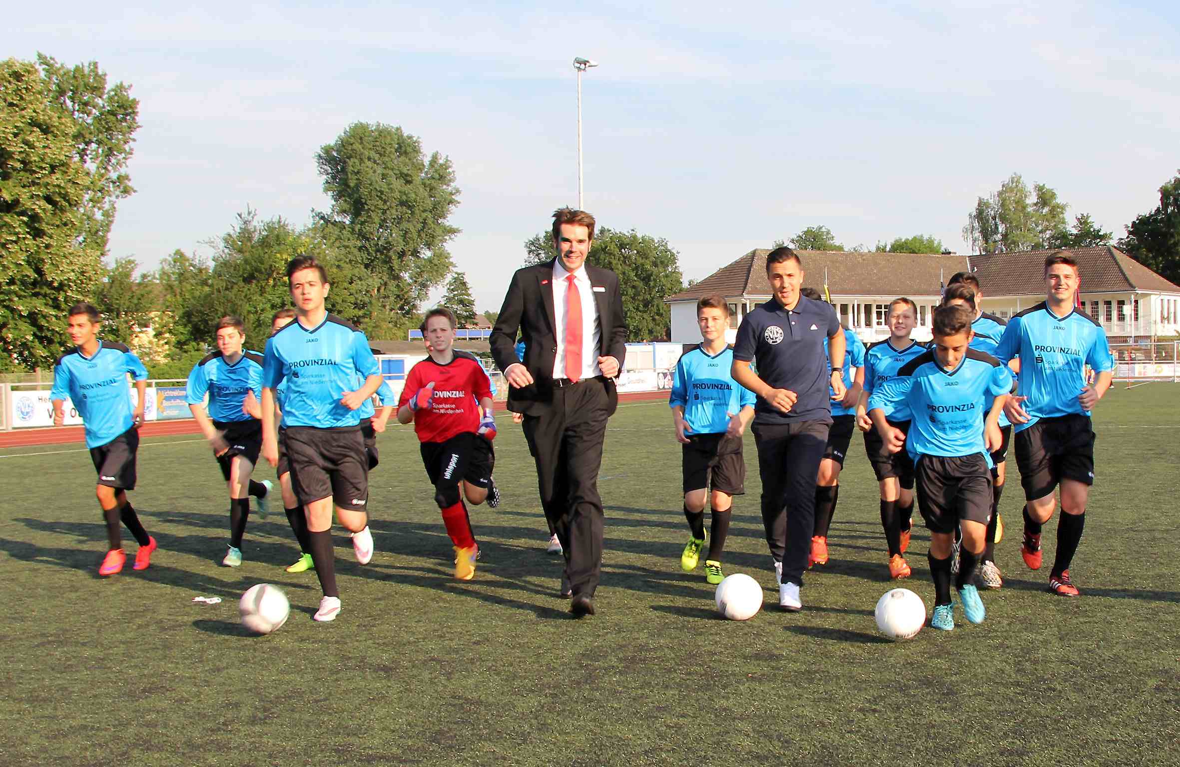 MOERS. Zum Trainingsbesuch der C1-Jungenmannschaft des VfL Repelen hatte Geschäftsstellenleiter Stefan Ertelt den jungen Kickern neue Trikots mitgebracht: „Die Sparkasse am Niederrhein und die Provinzial-Versicherung wollen mit den 15 Feldspieler- und den zwei Torwart-Trikots der neu formierten Mannschaft den Rücken stärken.“ Co-Trainer Daniel Konietzko, der zusammen mit seinem Vater Siegfried die Jungs erst seit Kurzem coacht, freut sich über die zusätzliche Motivation: „Nach dem schmerzhaften Abstieg wollen wir in dieser Saison sofort wieder in die Leistungsklasse zurückzukehren.“ Zum Neuaufbau passen die neuen Trikots ganz wunderbar, glaubt auch Stefan Ertelt. Fürs Gruppenbild kickte der Sparkassen-Mann im Anzug mit und machte trotzdem eine gute Figur.