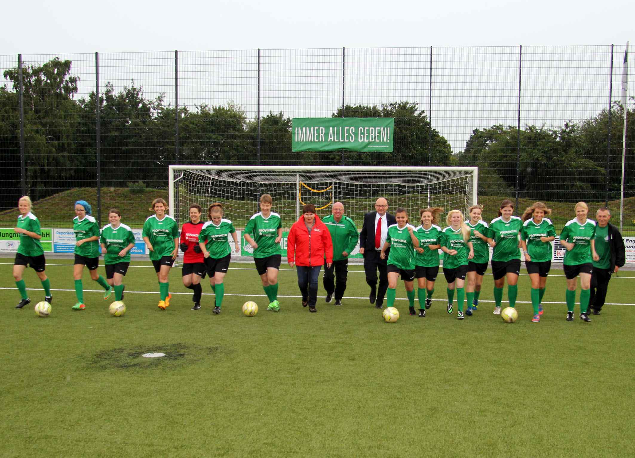 Maria Deselaers und Frank Menges (In der Mitte mit Vorstand Michael Kolkenbrock) besuchten das Training der Damenmannschaft des SV Menzelen. Ganz rechts: Trainer Klaus Krupper.