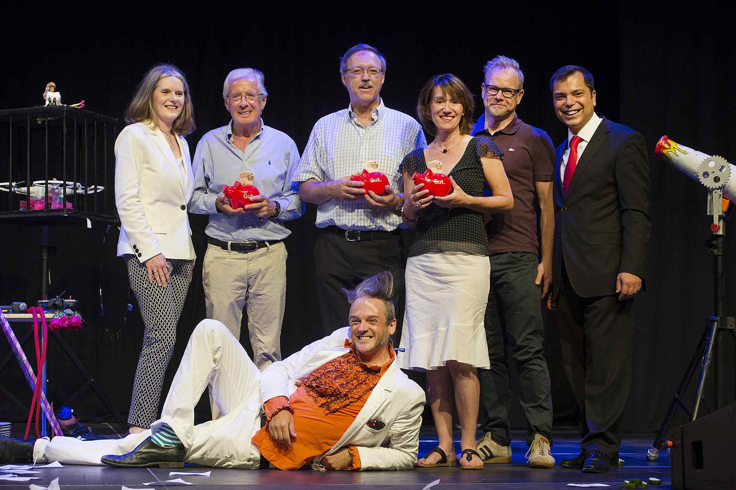 Verwaltungsratsvorsitzende Claudia van Dyck (l.) und Sparkassenchef Giovanni Malaponti (r.) überreichten die viermal 250 Euro Extraspenden an Rolf Bongards (Förderverein der Palliativstation im St. Josef-Krankenhaus), Manfred Brücker (Multiple-Sklerose-Selbsthilfegruppe), Karin Menzel (Neues Evangelisches Forum) und Achim Jansen-Tersteegen (Elterninitiative Rasselbande). Vorne: Der Schweizer Komödiant Dottore Antonio „Superbuffo“ Caradonna.