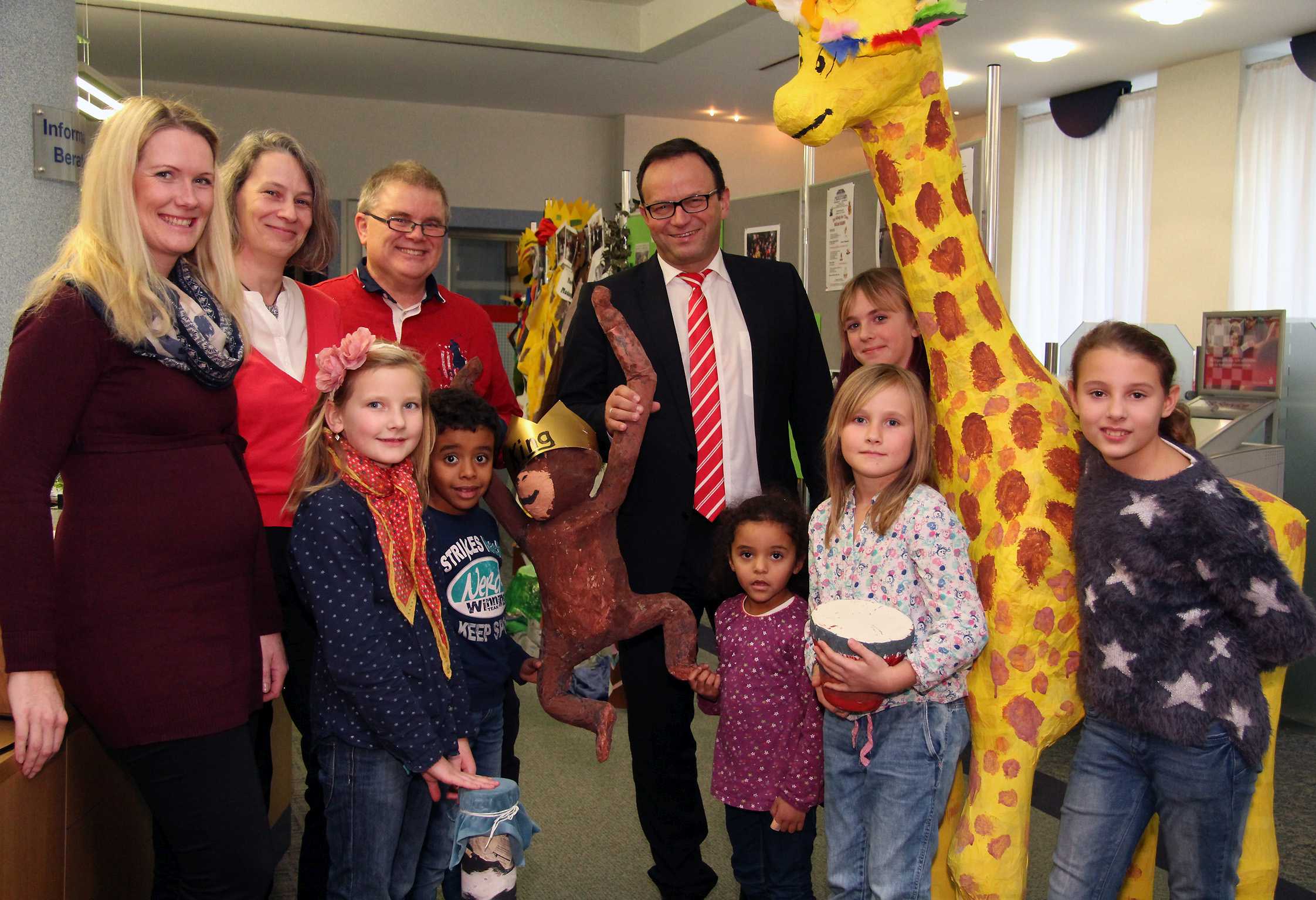 RHEINBERG. Im weltbekannten Musical gibt es nur einen König der Tiere, das ist der Löwe. – Quatsch, sagten sich über 100 Rheinberger Kinder und entwickelten im Rahmen der Herbstferien-Aktion von Diakonischem Werk und städtischer Begegnungsstätte Reichelsiedlung ihre ganz eigene Version des musikalischen Theaterstücks. Hier sind alle Tiere wichtig und jeder darf mal König sein. „Wir haben keine Vorgaben gemacht, alle Inhalte, Kostüme und Requisiten stammen von den Kindern“, sagt Bernard Bauguitte von der Diakonie. Wer die Aufführung der sechs Episoden beim 17. Internationalen Kinderfest verpasst hat, kann sie jetzt in einer Ausstellung in der Sparkasse an der Bahnhofstraße nacherleben. Sie ist bis zum 21. Dezember zu sehen. Die Sparkasse am Niederrhein hat die Ferien-Aktionen von Anfang an unterstützt.