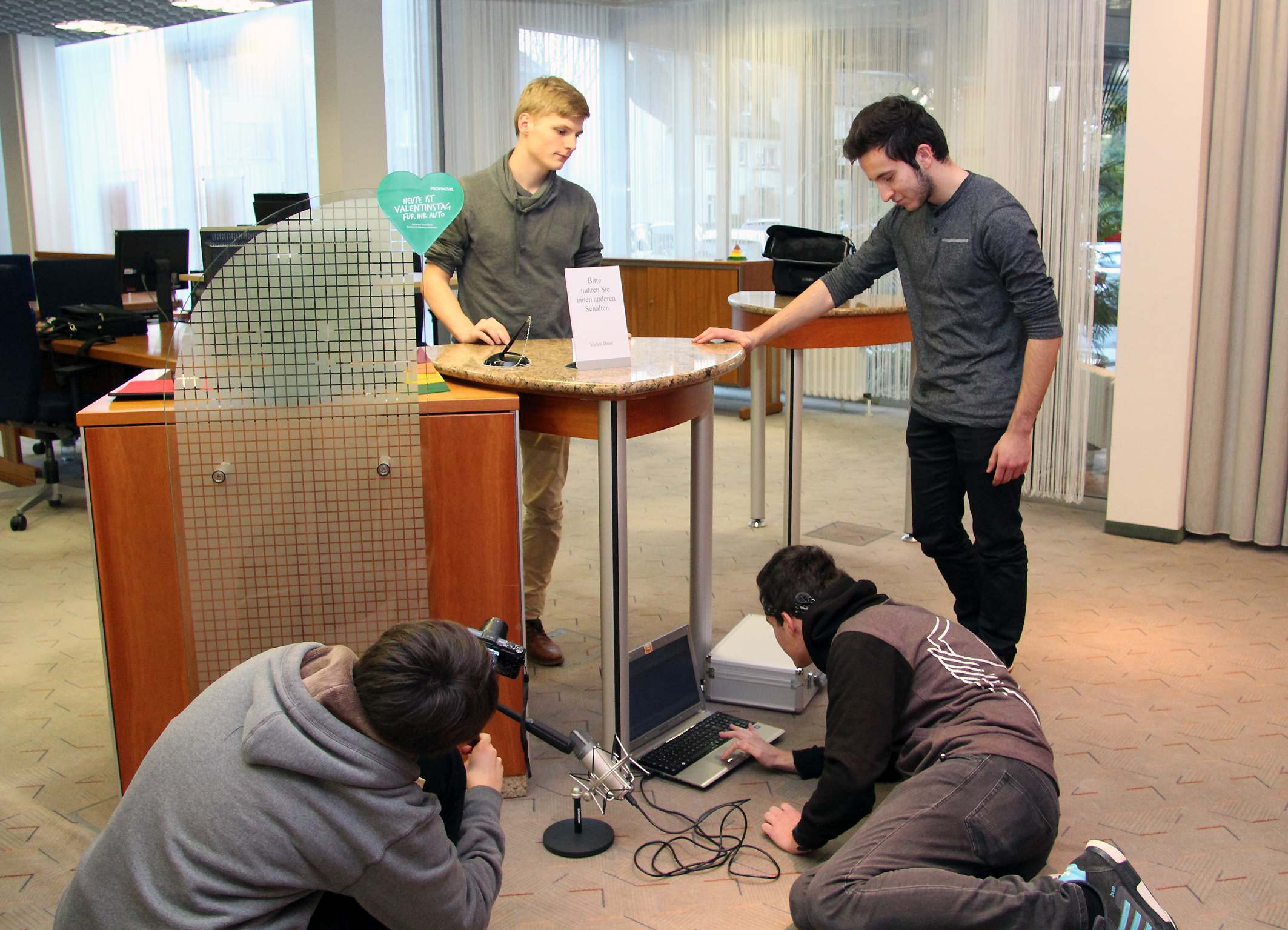 Schüler des Moerser Grafschafter Gymnasiums beim Dreh für ihr „Knete für die Fete“-Video in der Kundenhalle unserer Hauptstelle: Mara (l.) sucht den besten Kamerawinkel, Robin stellt den Pegel fürs Mikrofon am Laptop ein, während die Schauspieler Felix und Roman sich mit dem Drehort vertraut machen.