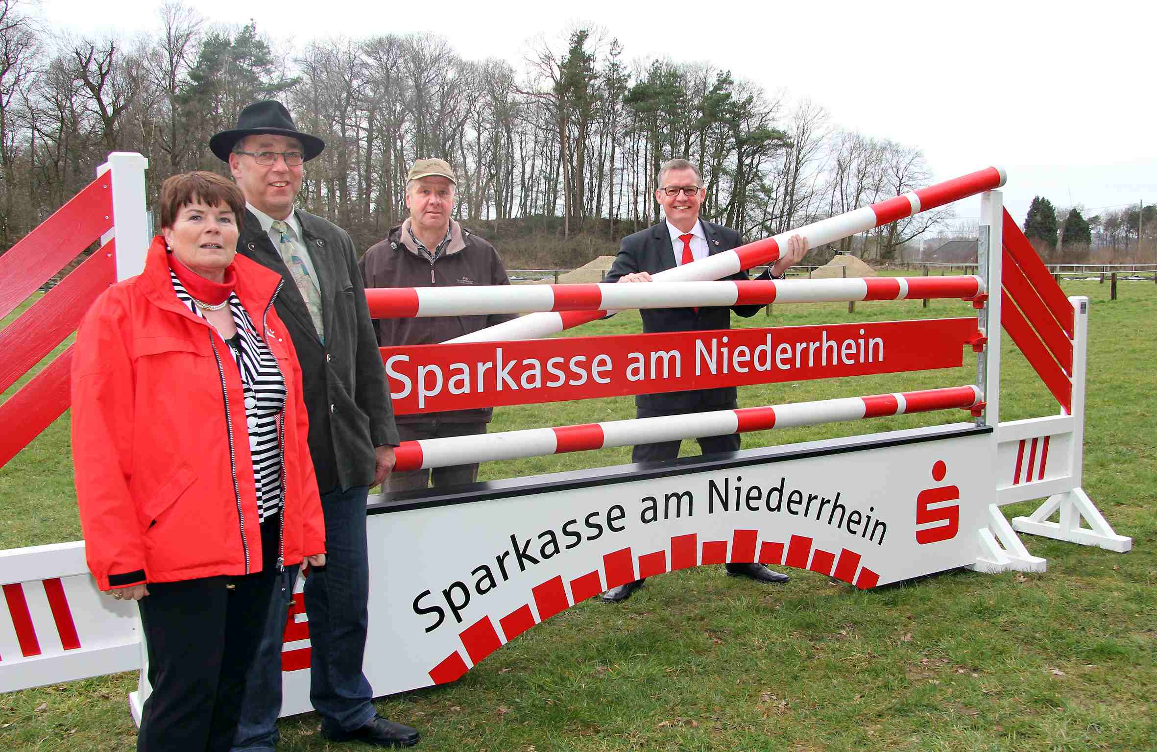 ALPEN. Noch vor dem Festakt zum 150-jährigen Bestehen überreichten jetzt Maria Deselaers (l.) und Vorstand Bernd Zibell (r.) von der Sparkasse am Niederrhein dem Reiterverein Eintracht Veen einen neuen Sprung. Vereinspräsident Heinz-Gerd Giesen (2. v.l.): „Wir freuen uns über das vorzeitige Geburtstagsgeschenk ganz besonders, weil wir es nämlich gut für unser Jubiläumsturnier gebrauchen können." Der Sprung, so nennen Reiter ein Hindernis, ersetzt einen alten, der im Laufe der Jahre arg gelitten hatte. Vizepräsident Werner Keisers (3. v.l.) schmunzelt: „Das liegt nun mal in der Natur der Sache." Das neue, 2500 Euro teure Sportgerät wurde von einem Spezialbetrieb hergestellt und verspricht eine lange Lebensdauer. Das freut auch Bernd Zibell: „Der Sparkassen-Sprung ist ein echter Hingucker!"