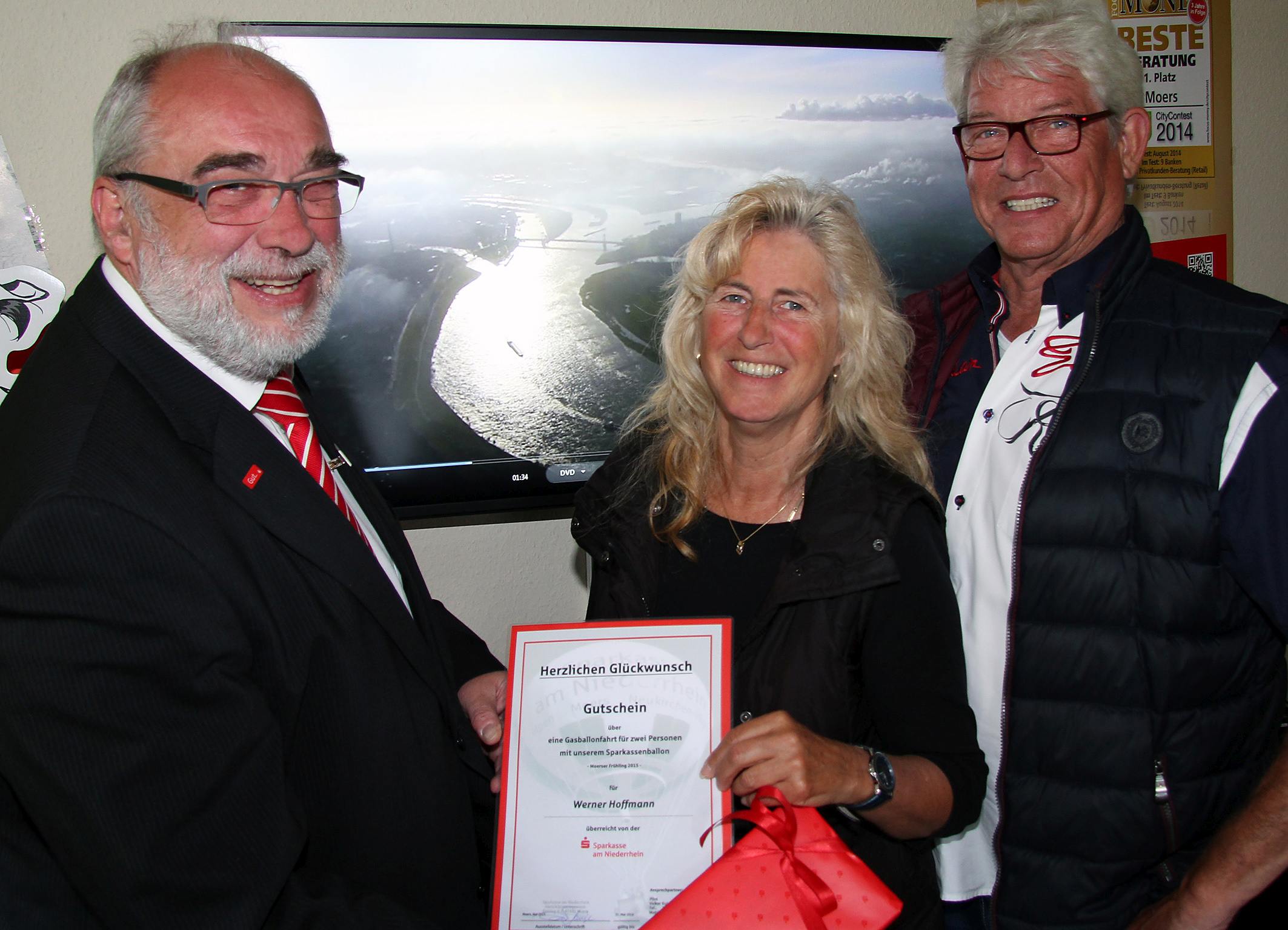 Werner Hoffmann (ganz rechts) und Regina Dömkes erhielten von Sparkassen-Vertriebschef Heiner Rütjes den Gutschein für die Fahrt mit dem Gasballon.