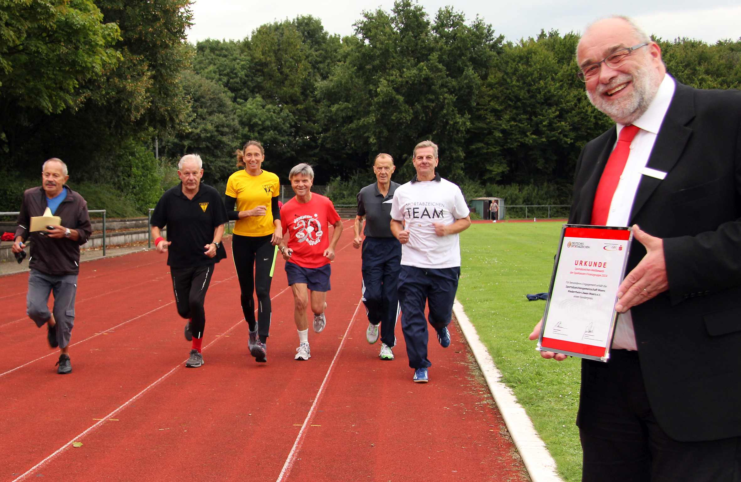 Die Aktiven der Sportabzeichengemeinschaft Moers erhielten jetzt einen Sonderpreis (v.l.n.r.): Reinhard Rexin, Hans Verhoeven, Claudia Tolksdorf, Wilfried Schwake, Klaus Weyers und Harald Hau. Ganz rechts: Heinz-Josef Rütjes.