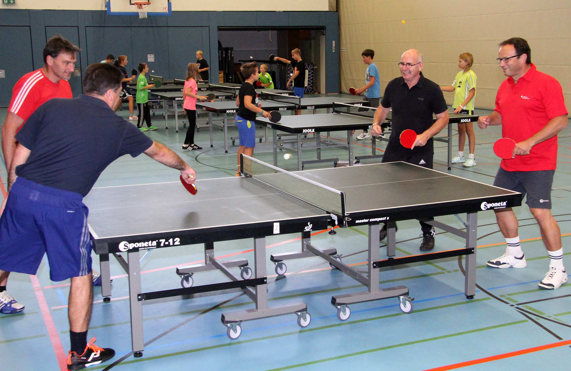 RHEINBERG. Freitagnachmittag in der Turnhalle der Europaschule: Das helle Klackern verrät schon in der Umkleide, dass dort gerade Tischtennis gespielt wird. Carsten Lindner vom TUS Rheinberg trainiert hier regelmäßig zehn Schülerinnen und Schüler. Doch jetzt war für die Kids der Tischtennis-AG ein besonderer Tag: Um die vier neuen, von der Sparkasse am Niederrhein gespendeten Tischtennis-Platten einzuweihen, dürfen sie ein Turnier spielen. Während Carsten Lindner bei den Kleinen ab und zu als Schiedsrichter gefragt ist, kommen die großen Gäste ohne ihn aus. Schulleiter Norbert Giesen und Abteilungsleiter Martin Reichert treten beim Dankeschön-Doppel gegen Sparkassenvorstand Frank-Rainer Laake und Frank Tatzel an. Nach einem Satz voller Tempo und Finesse heißt es 17:15 fürs Team Sparkasse.