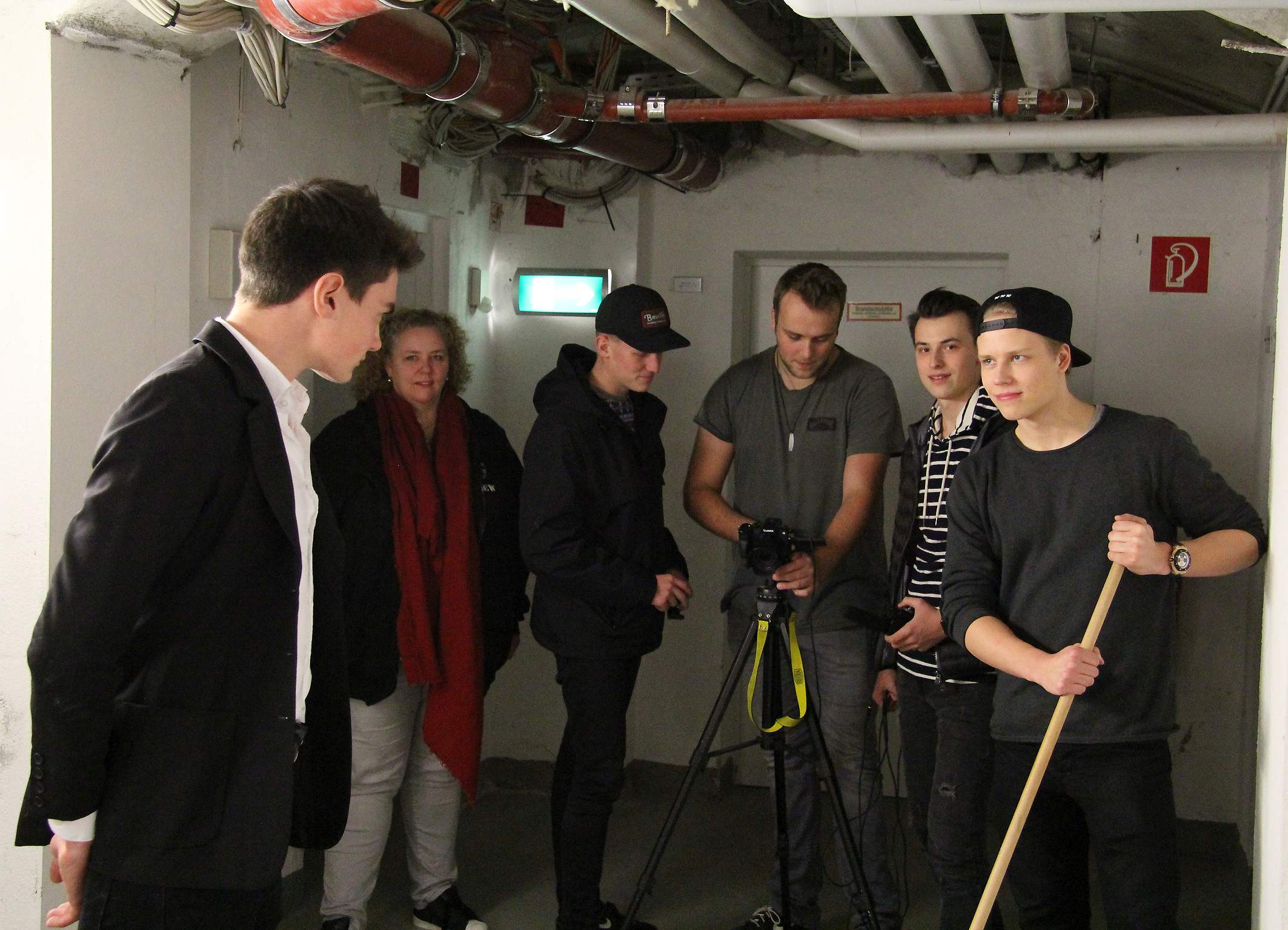 „Ruhe“, sagt Jan Sellerbeck und startet die Kamera. Eine Fahrstuhltür gleitet auf. Heraus tritt Christopher West, smart und im schwarzen Anzug. Mit Geheimagenten-Blick geht er auf die Kamera zu, um dann tölpelhaft über einen Besen zu stolpern. Sechs-, siebenmal muss die Szene wiederholt werden. „Jetzt aber los“, drängen Luis Kühnen, Lennart Bogdahn und Frederic Hannen zum Aufbruch. Die Filmcrew packt die Ausrüstung zusammen und ab geht’s zum nächsten Drehort in den Landschaftspark Duisburg Nord. Lehrerin Regine Meyering schließt ab, lacht und sagt: „Das wird ein super Film!“
