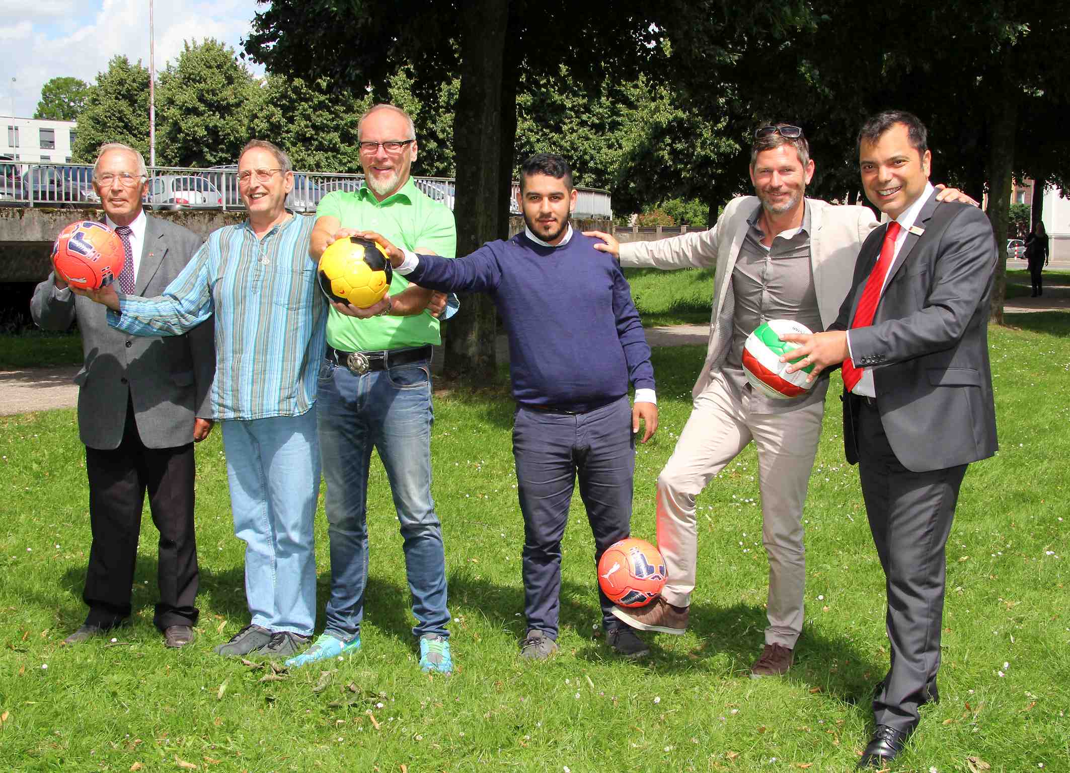 Wolfgang Jansen (GSV), Amar Azzoug (Bunter Tisch), Freddy Fischer, Cihan Karabulut (Bunter Tisch), Michael Paßon (Klartext für Kinder) und Sparkassen-Chef Giovanni Malaponti rufen alle Hobby- und Vereinskicker auf: „Bewerbt euch für das Bunte Fußballturnier am 13. August auf der Sportanlage des GSV am Solimare.“