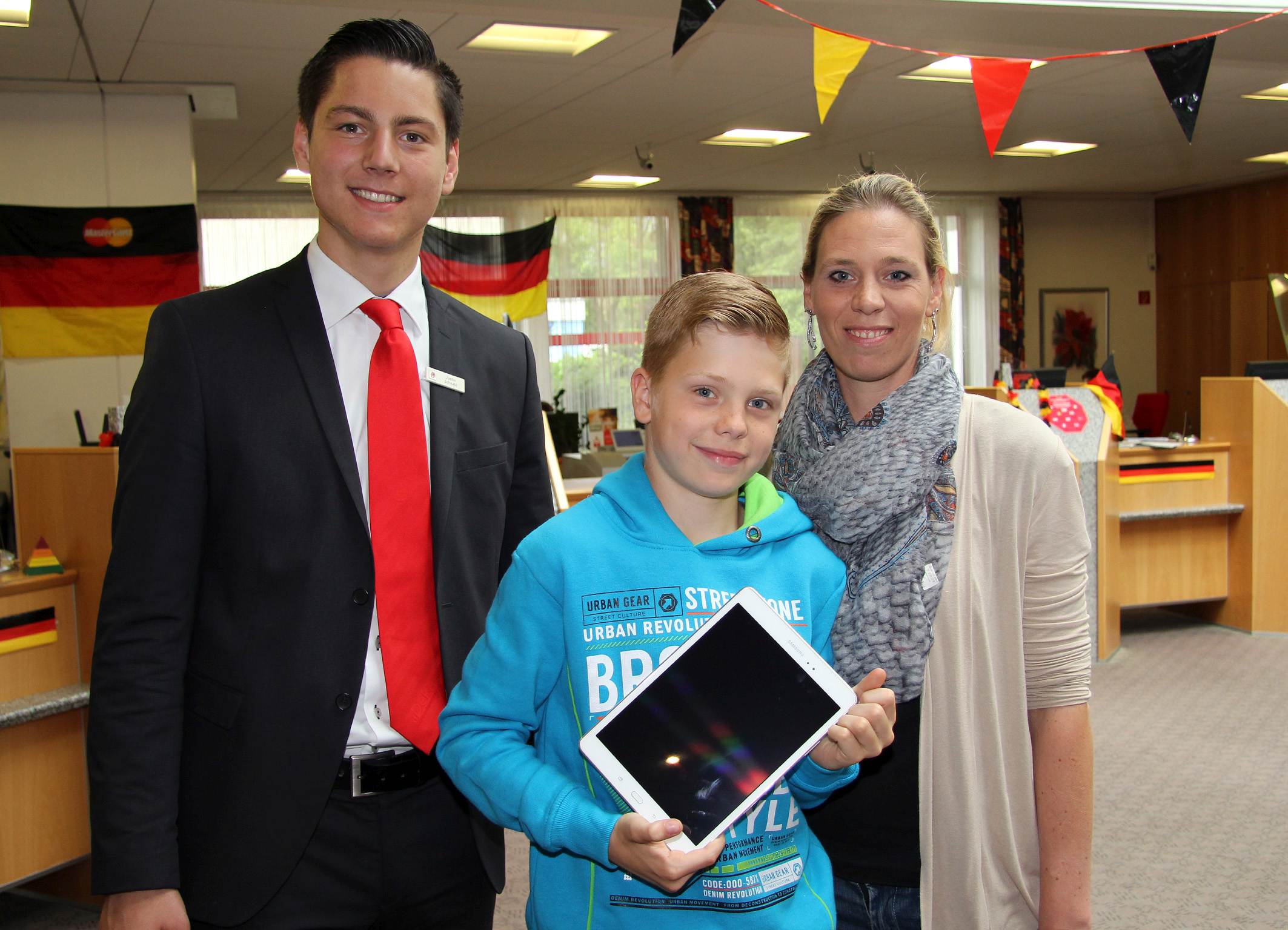 Jannis Broß (Mitte) hat beim Gewinnspiel der Sparkasse am Niederrhein ein Tablet gewonnen. Azubi Justin Schnabl gratuliert herzlich. Mutter Daniela Broß freut sich mit ihrem zehnjährigen Sohn.