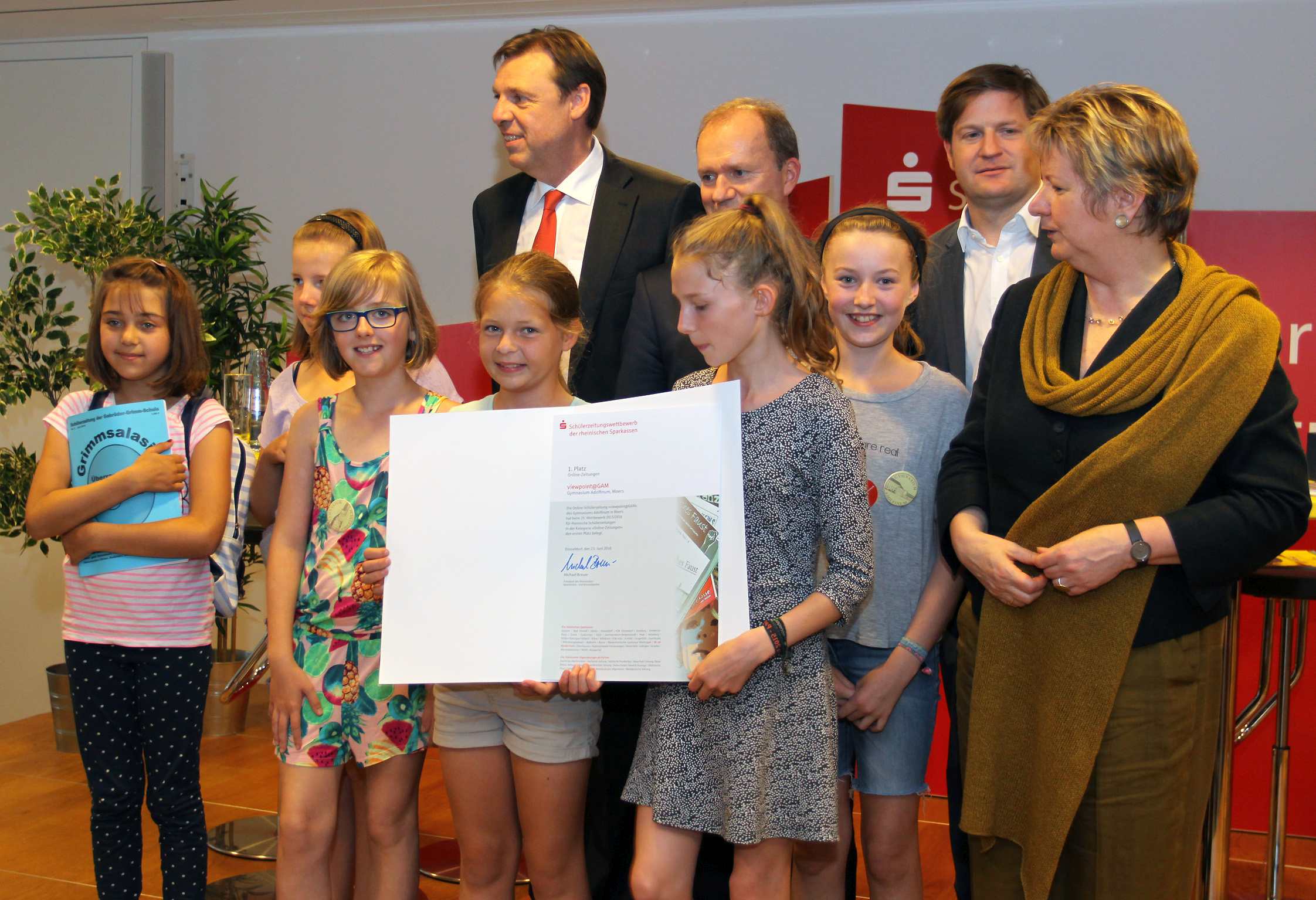 MOERS. Als Schulministerin Sylvia Löhrmann ihnen die Urkunden überreichte, strahlten die jungen Nachwuchsjournalisten aus Moers vor Freude und Stolz: Die Online-Zeitung des Adolfinums (Viewpoint@GAM) ist die beste im ganzen Rheinland – und „Grimmsalasim“, die Schülerzeitung der Gebrüder-Grimm-Schule, belegte den fünften Grundschul-Platz. „Das habt ihr richtig toll gemacht“, lobte die Ministerin Laura Muth (10) und Emma Lampke (10) von der Gebrüder-Grimm-Schule sowie Stella Buhl (10), Lisa Wagner (12), Mia Mechels (12) und Finja Kußel (12) vom Gymnasium Adolfinum. Von Sparkassenpräsident Michael Breuer erhielten die Grundschülerinnen 250 Euro Preisgeld und die Gymnasiastinnen 800 Euro. Mia: „Jetzt können wir uns eine gute Kamera und ein besseres Layout-Programm kaufen.“
