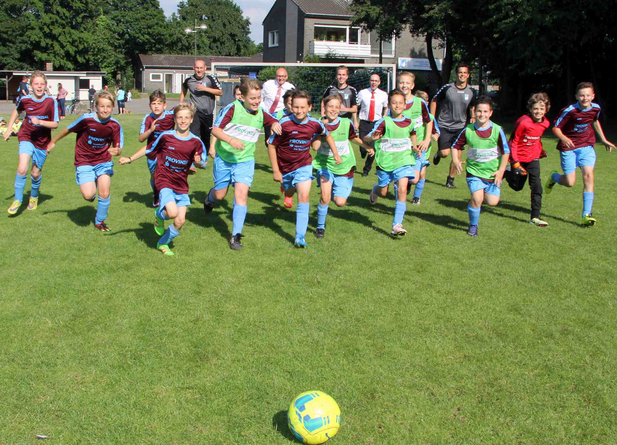 Sturm der D-Jugend des TV Kapellen im neuen Trikot. Hinten laufen (ganz links) Trainer Wolfgang Kowalski sowie Frank Menges und Michael Züscher von der Sparkasse (beide im weißen Hemd) und ganz rechts Co-Trainer Marc Mahlberg mit.