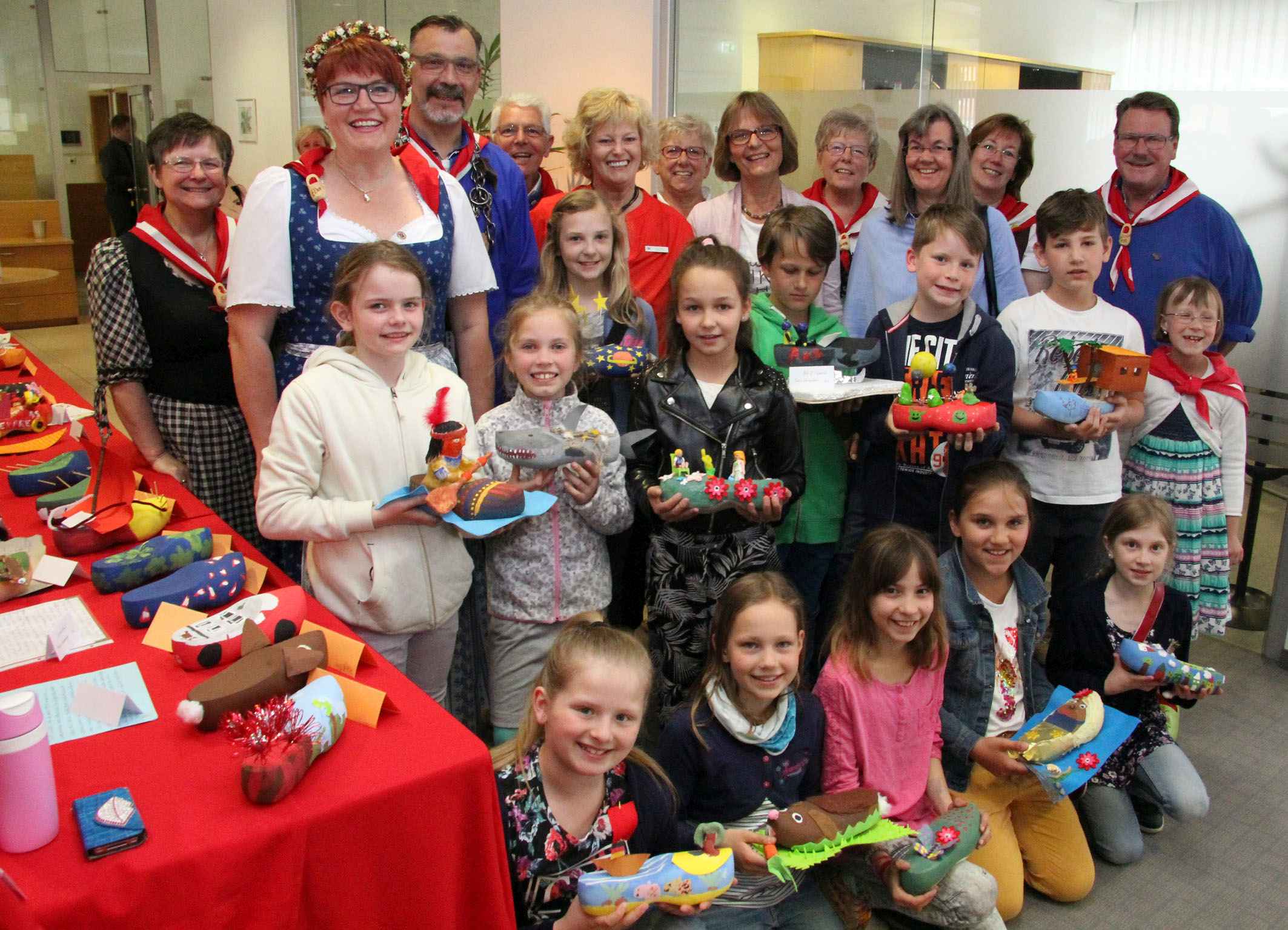 Die Viertklässler der Antoniusschule, hier mit Klompenkönigspaar Elke und Dirk Buttkereit, stellen noch bis Mitte Juni ihre bunten Holzschuhe in der Sparkasse in Vluyn aus.