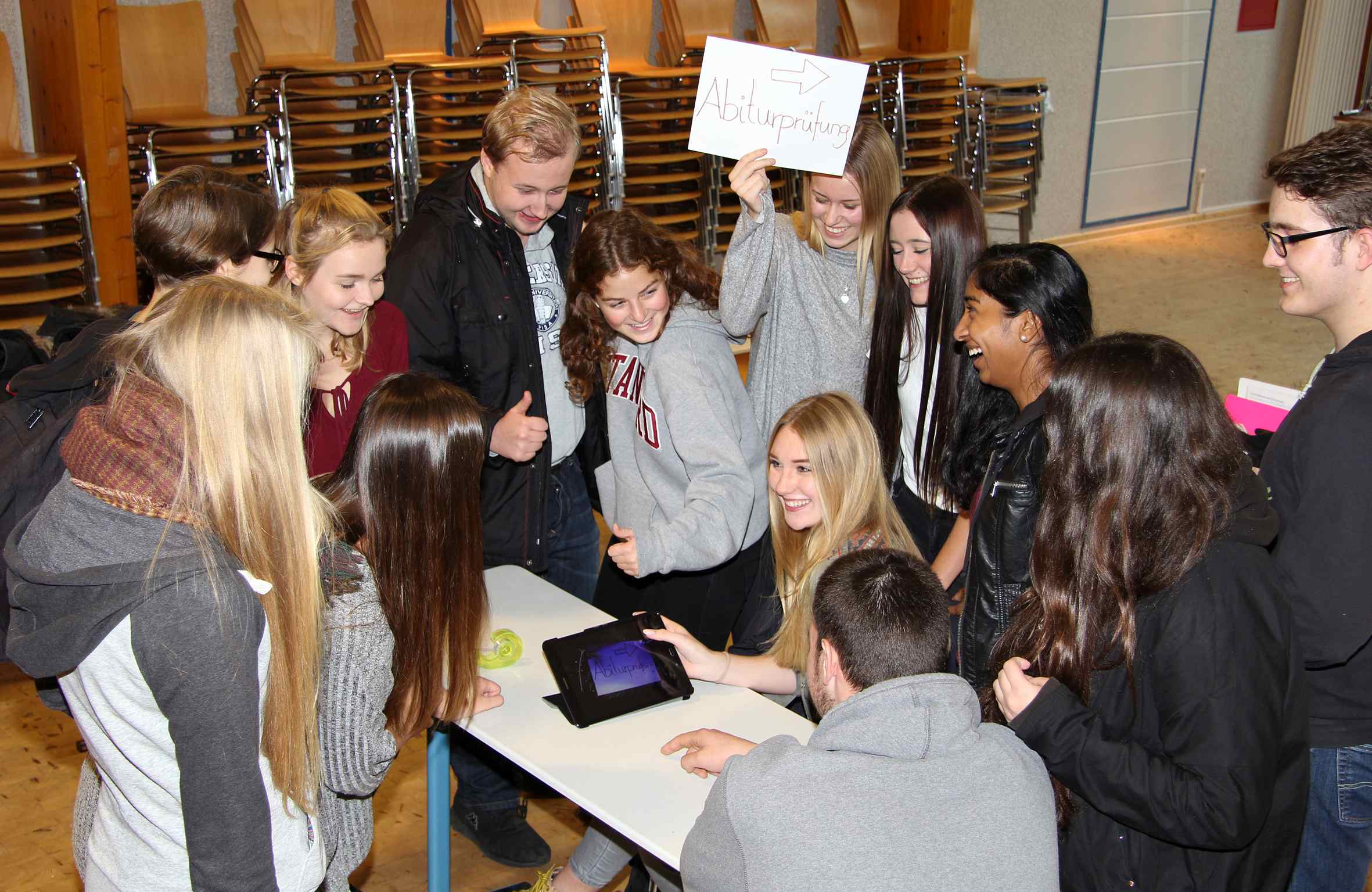 Das Filmteam und die Statisten betrachten die Rohfassung des Videos, mit dem sie beim Wettbewerb „Knete für die Fete“ bis zu 1.000 Euro für ihre Abschlussparty im Amlonius-Gymnasium gewinnen wollen.