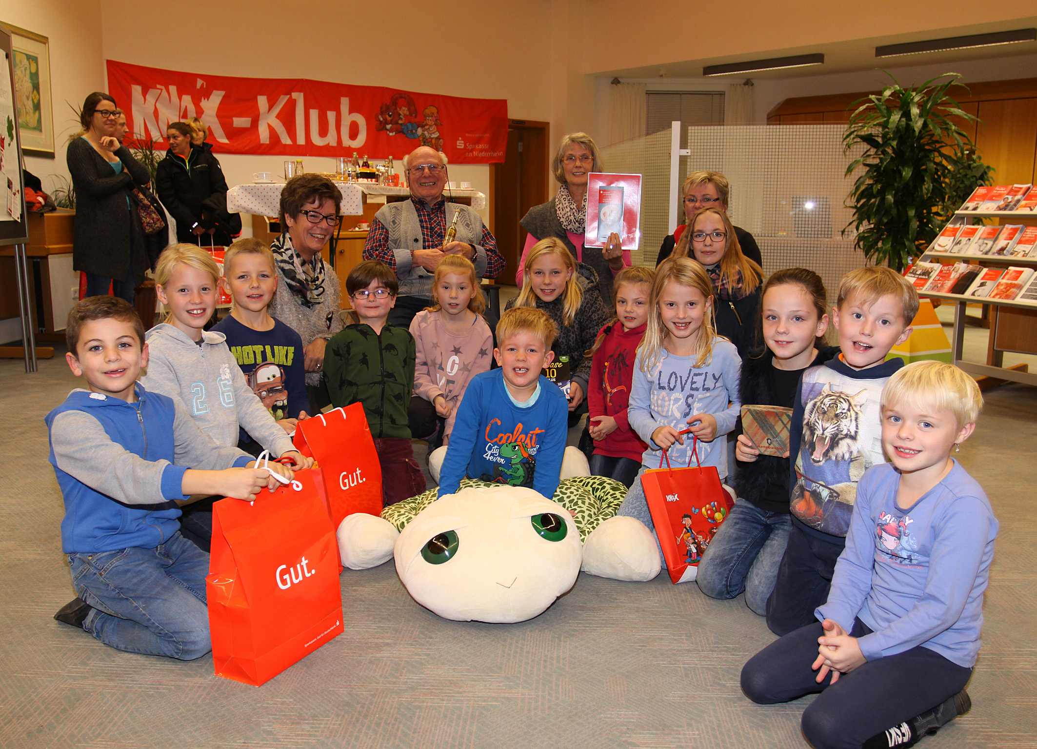 Maria-Anna Rütter-Koppers (hinten, rechts) überreichte in der Geschäftsstelle Hochbruch viele Preise: links neben ihr Helga Hantzsche mit dem Gutschein für die Gasballonfahrt, ganz vorne Noah auf seiner Schildi.