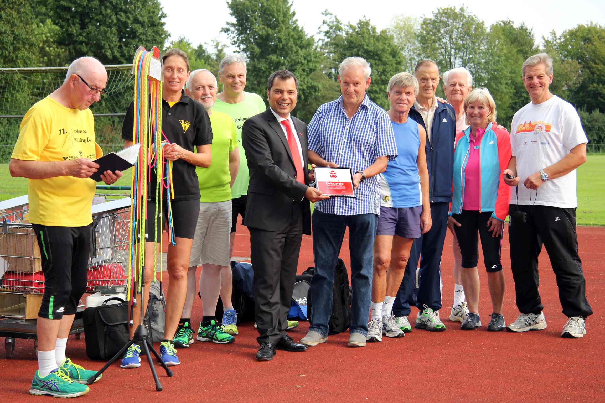 Giovanni Malaponti überreicht im Namen des Deutschen Olympischen Sportbundes und der Sparkassen-Finanzgruppe den Sonderpreis beim bundesweiten Sportabzeichen-Wettbewerb an den Vorsitzenden der SAG Moers, Hans Verhoeven. Die Sportkameraden freuen sich zudem über den Gewinn des Triples.