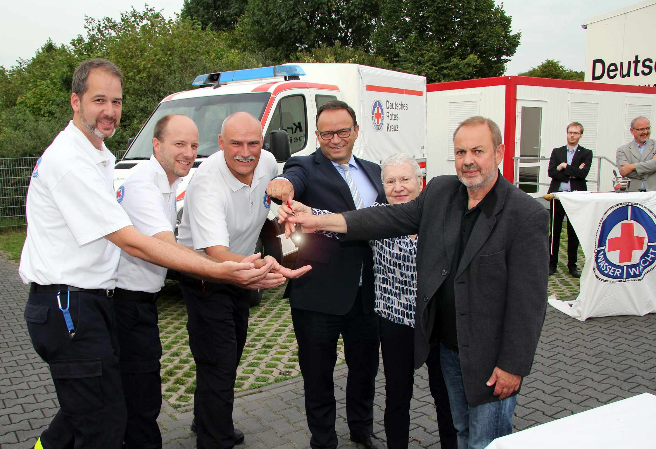 Jan Höpfner, Christian Vorstius und Klaus Püttmann von der Wasserwacht nehmen den Schlüssel des neuen Gerätewagens von Sparkassenvorstand Frank-Rainer Laake, Gisela Bangen, Vorsitzende des DRK-Kreisverbandes Niederrhein, und Ulrich Rassier, Koordinator Gefahrenabwehr für den Kreis Wesel, entgegen. Im Hintergrund beobachten Pfarrer Udo Otten und Pastoralreferent Werner Koschinski die Schlüsselübergabe für das zuvor von ihnen gesegnete Fahrzeug.