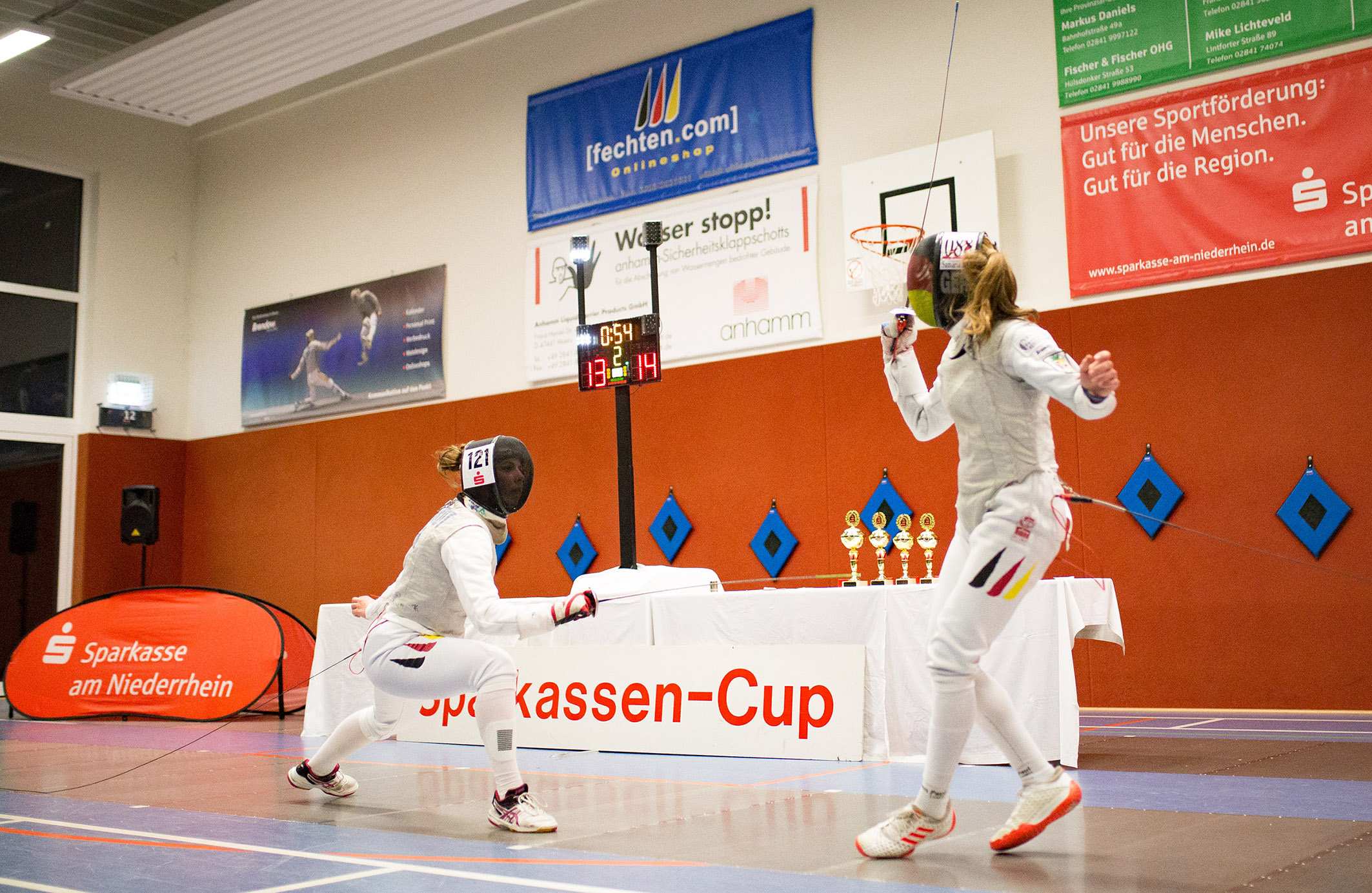 MOERS. Manche standen und starrten stumm, andere saßen auf ihren Stühlen und konnten kaum hinsehen. 200 Zuschauer erlebten beim Finale im Damenflorett der A-Jugend um den Sparkassen-Cup ein Wechselbad der Gefühle. Zum Greifen nah schien der Sieg der Lokalmatadorin Johanna Féron. Die 16-Jährige vom Fechtclub Moers führte 50 Sekunden vor Schluss mit 14 zu 13. Dann konterte Maike Erhardt von der TSG Weinheim, setzte zwei Treffer und entschied damit das Gefecht für sich. Dennoch ist der zweite Platz beim internationalen Qualifikationsturnier für Johanna Féron ein schöner Erfolg. Die Moerserin sicherte sich damit endgültig ihre Teilnahme an den kommenden Welt- und Europameisterschaften.