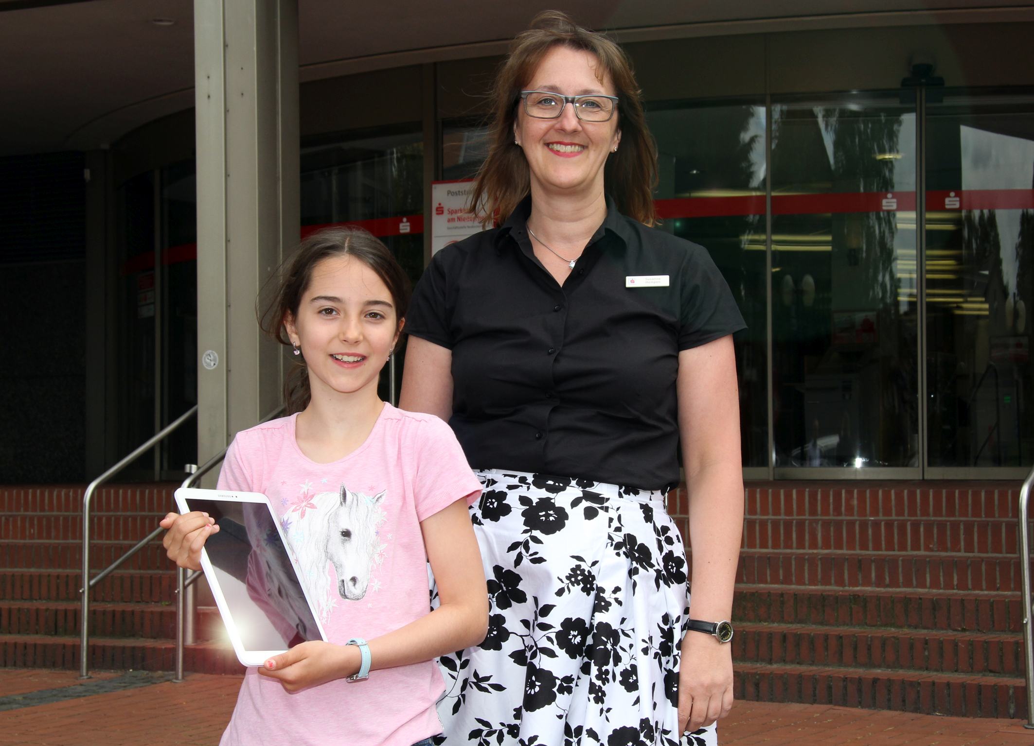 Die zehnjährige Leni Wohlgemuth zeigt ihr neues Tablet. Das hat sie bei einem Gewinnspiel der Sparkasse am Niederrhein gewonnen. Kundenberaterin Susanne Hempen gratuliert herzlich.