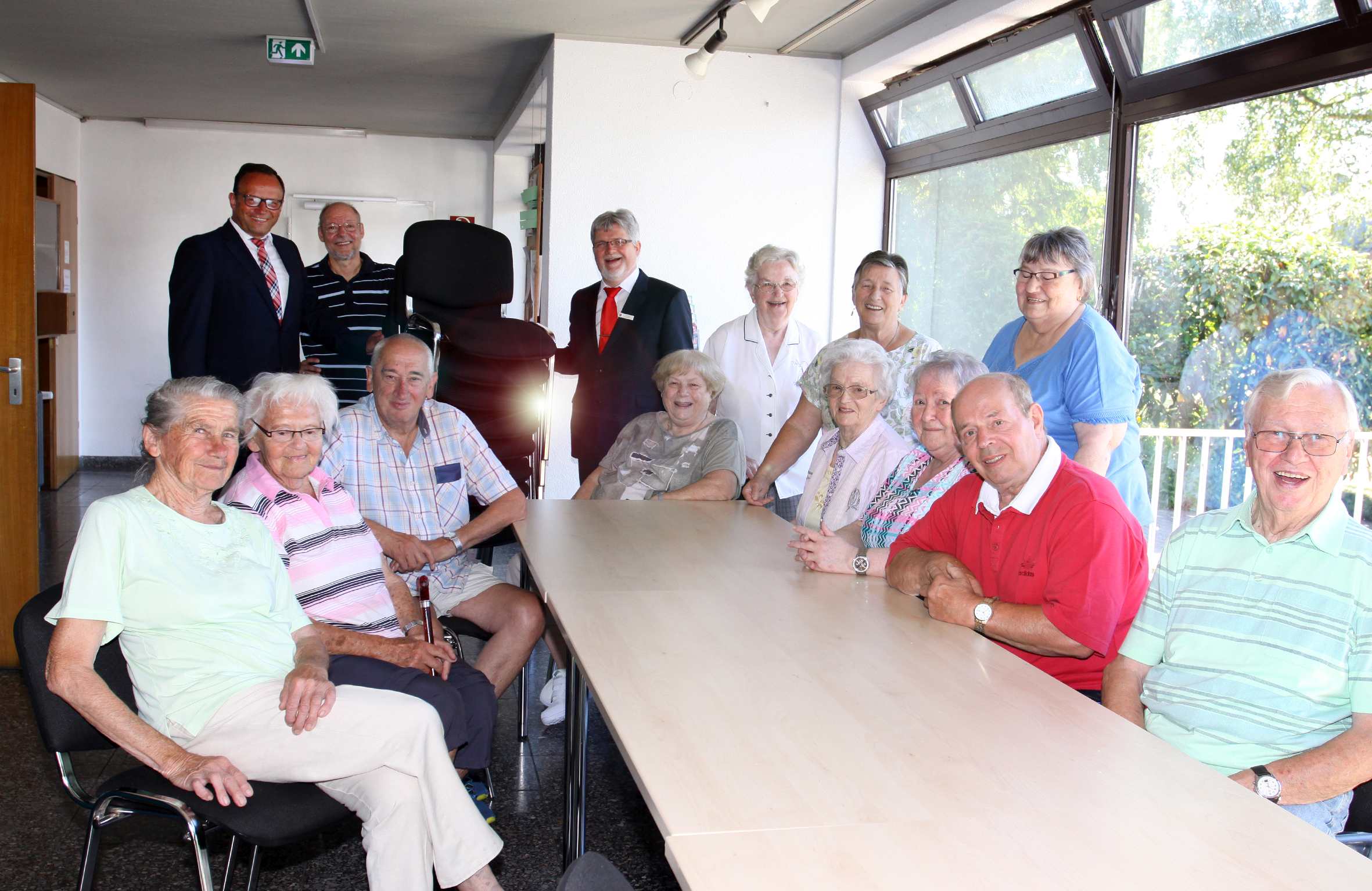 Die Reha-Sportler betätigten sich gerne als Test-Sitzer. Die von der Sparkasse am Niederrhein mit 2.000 Euro bezuschussten 220 neuen Stühle für Concordia Ossenberg sind zudem gut stapelbar, wie Vereinspräsident Burghard Kretschmer (hinten) seinen Gästen Frank-Rainer Laake und Heinz Geßmann demonstrierte.
