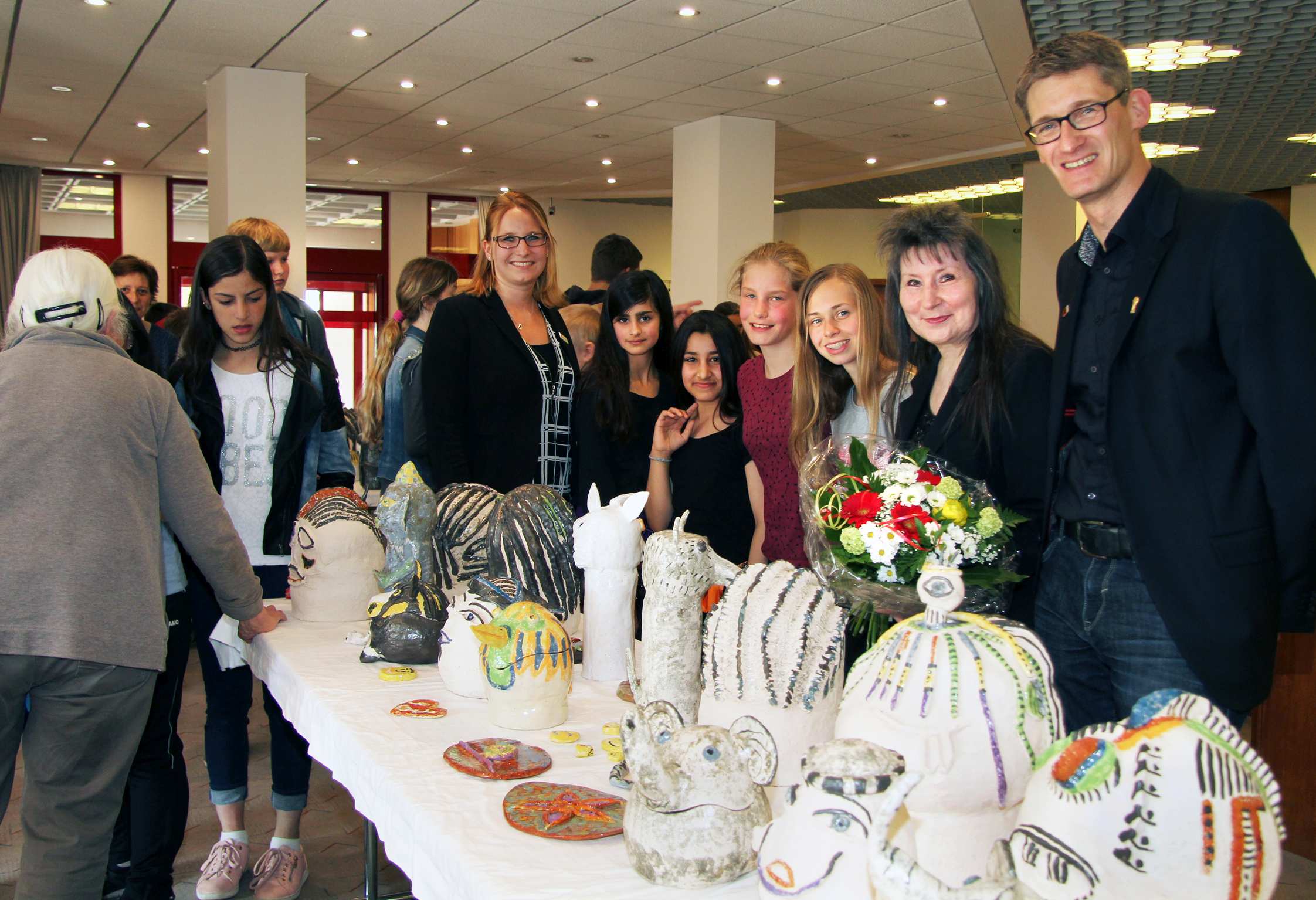 ALPEN. Eine fröhliche Ausstellungseröffnung erlebten Kunden jetzt in der Sparkasse an der Burgstraße. Geschäftsstellenleiterin Kathrin Hüsch begrüßte rund 40 Schülerinnen und Schüler der Sekundarschule Alpen sowie ein gutes Dutzend Eltern und Lehrer, um sich die von den Kindern selbst gemachten Keramiken anzuschauen.