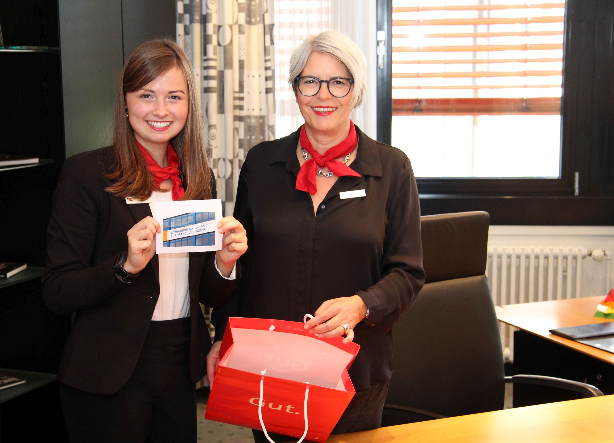Julia Pilger und Monika Pogacic ermittelten, wer die erste Extra-Knete von der Sparkasse am Niederrhein bekommt. Herzlichen Glückwunsch, liebes Team vom Rheinkamper Gymnasium!