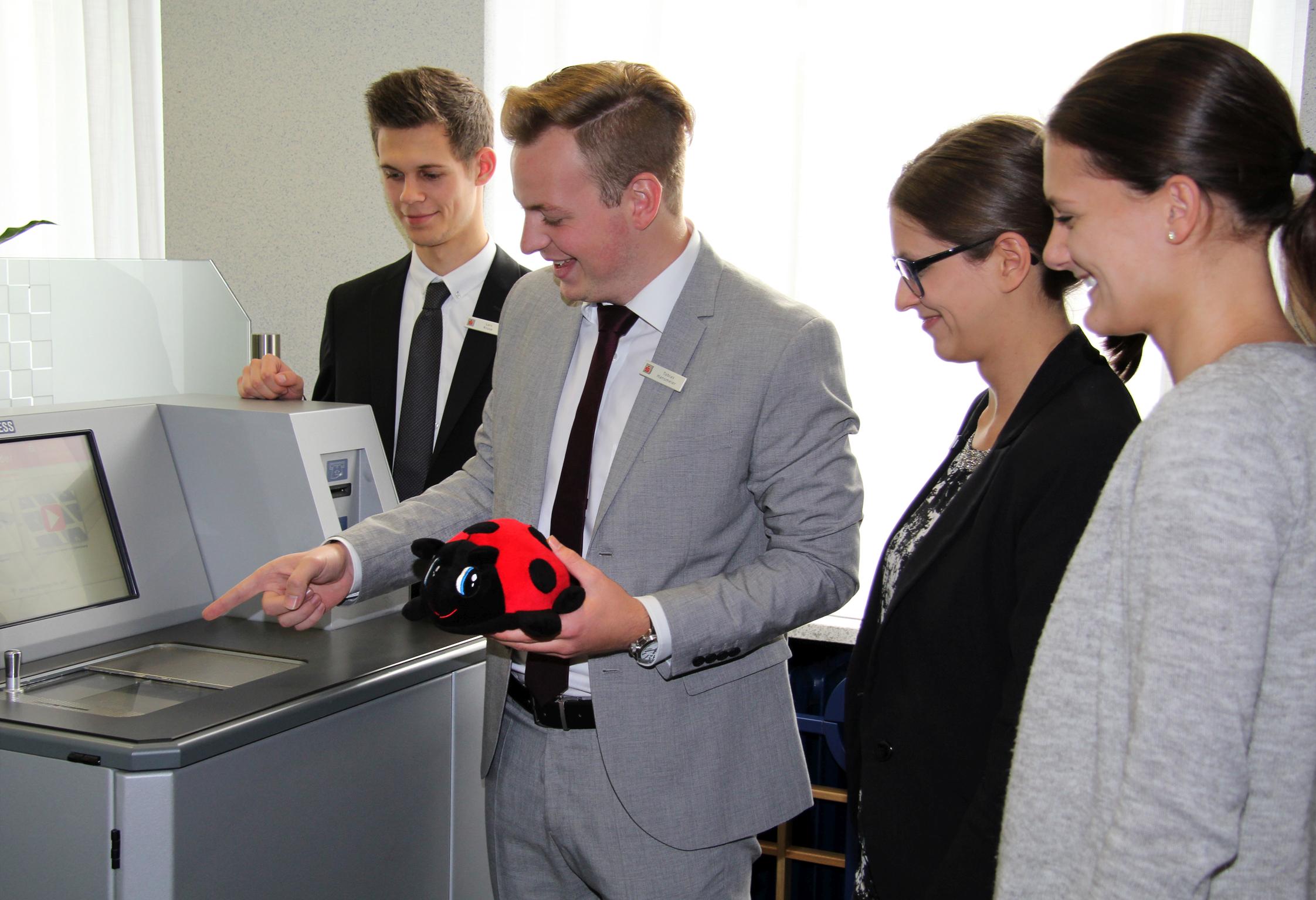 NIEDERRHEIN. Lucy ist ein neugieriger Plüschkäfer. Sie und ihre zahlreichen Zwillingsschwestern freuen sich auf die Weltsparwoche bei der Sparkasse am Niederrhein. Dann dürfen sie raus aus den Kartons und bekommen ein neues Zuhause. Denn jedes Kind, das vom 30. Oktober bis zum 3. November seine angesammelten Euros und Cents in unseren Geschäftsstellen auf dem Sparbuch gutschreiben lässt, darf sich ein kleines Dankeschön mitnehmen, beispielsweise Lucy. Die besuchte heute die Geschäftsstelle an der Bahnhofstraße in Rheinberg. Lars Kruse, Tobias Hansmeier, Kristina Hafemeister und Annika Schmitz zeigen Lucy die Zählmaschine, in die die Kinder bald schon ihre Münzen schütten dürfen.