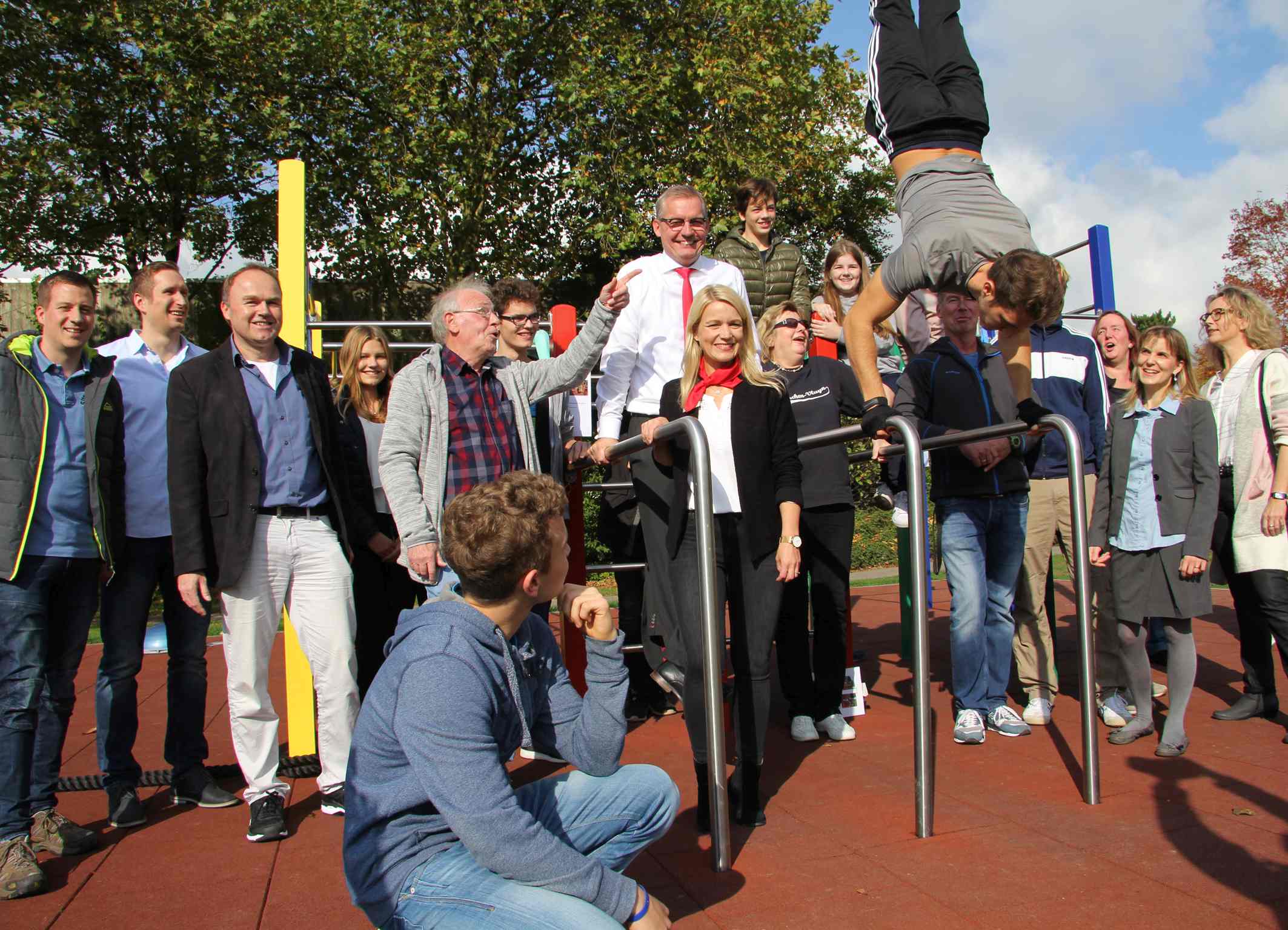 Mit einem Handstand und vielen anderen Übungen zeigte Dario Bones, was alles am neuen Calisthenics-Sportgerät am JSG möglich ist. Nach links: Dr. Susanne Marten-Cleef sowie Katrin Steffans und Bernd Zibell von der Sparkasse trainierten unter der Aufsicht von Franz Frings (5.v.l.) ein wenig mit.