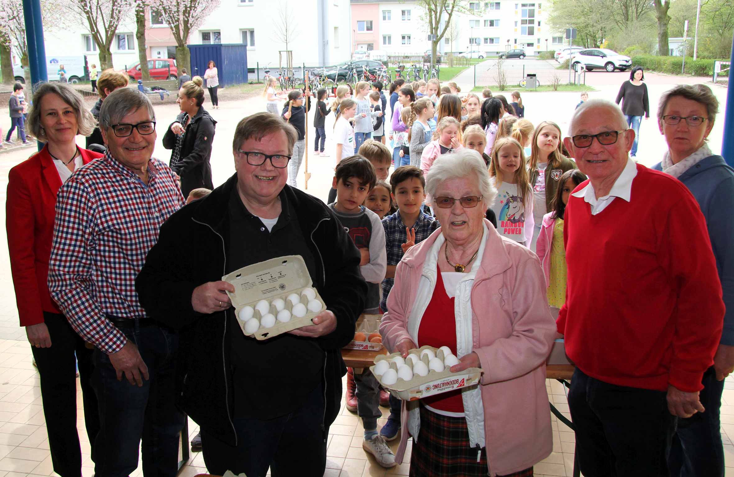 Die hartgekochten Eier sind bereit fürs Eierpicke, die rund 80 Grundschüler können es kaum erwarten, beim Brauchtums-Spektakel gegeneinander anzutreten. Andrea Kabs-Schlusen (v.l.n.r.) von der Sparkasse am Niederrhein sowie Bernhard Evers, Winfried Nickenig, Gertrud Bresser, Hans-Gerd Hackfurth und Hannelene Potjans vom Rhinberkse Sprookverein Ohmen Hendrek sorgten trotz viel Gewusel für einen reibungslosen Ablauf beim traditionellen Eier-Titsch-Wettbewerb.