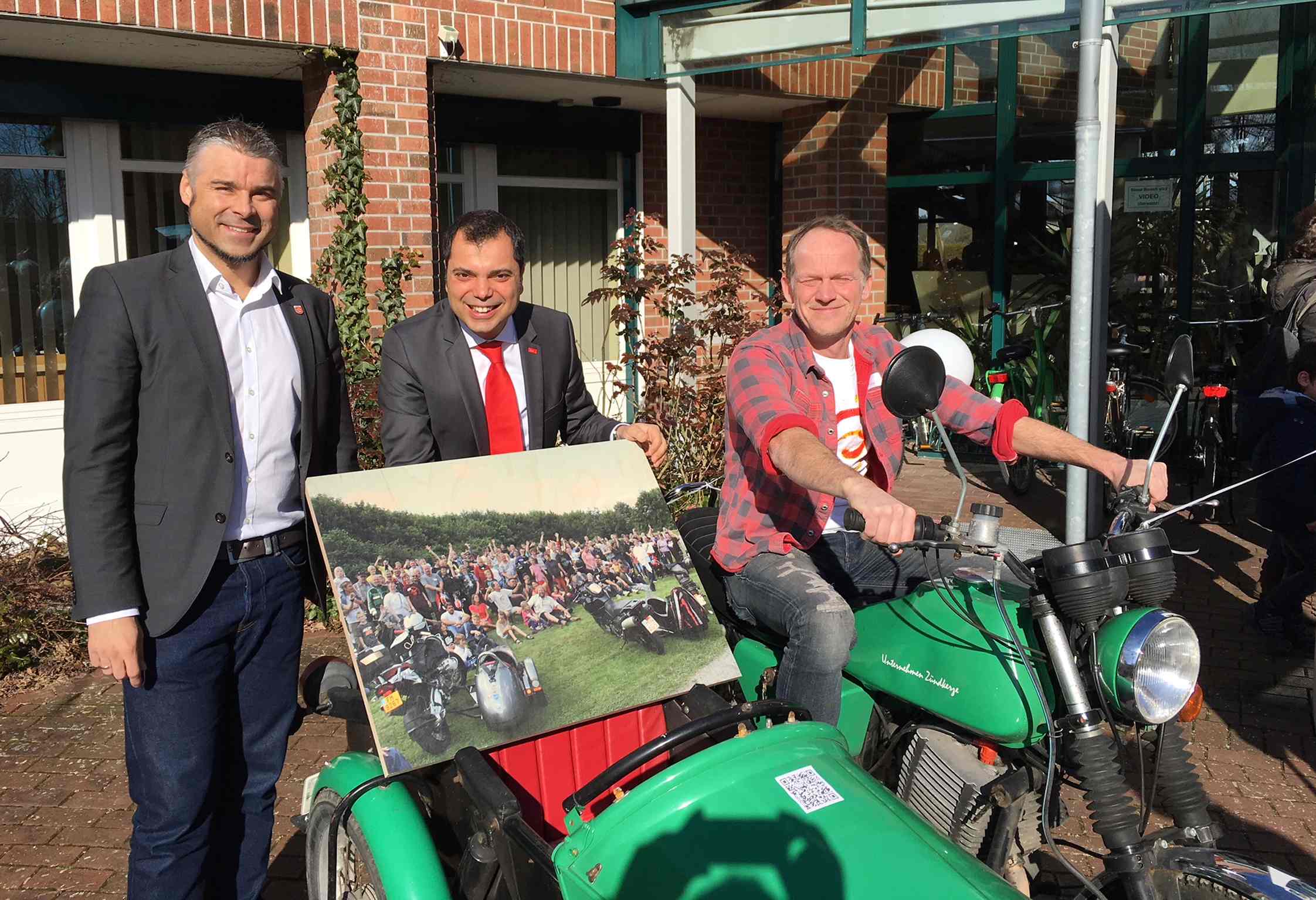 SONSBECK. Den 30. Juni hat sich Sparkassenchef Giovanni Malaponti rot im Kalender angestrichen: „Beim 20. Jumbo-Run will ich unbedingt dabei sein.“ Die Motorradausfahrten, die der gemeinnützige Verein „Unternehmen Zündkerze“ organisiert, sind Kult bei behinderten und nichtbehinderten Bikern. Eine Fotoausstellung im Foyer des Sonsbecker Rathauses zeigt die Begeisterung, die der Jumbo-Run bei Fahrern, Mitfahrern und Zuschauern regelmäßig auslöst. Aufgewertet wird die Ausstellung von einer interaktiven Bildergalerie sowie Interviews und Videos. Die werden ganz einfach mittels QR-Codes gestartet und auf dem Smartphone abgespielt. Das Konzept und die technische Realisation stammen von Studenten der Hogeschool van Arnhem en Nijmegen. Die Ausstellung mit dem Titel „Seit 1999 Gemeinsam Unterwegs – 100 % Leben“ ist noch bis zum 16. März zu den Öffnungszeiten des Rathauses zu sehen.