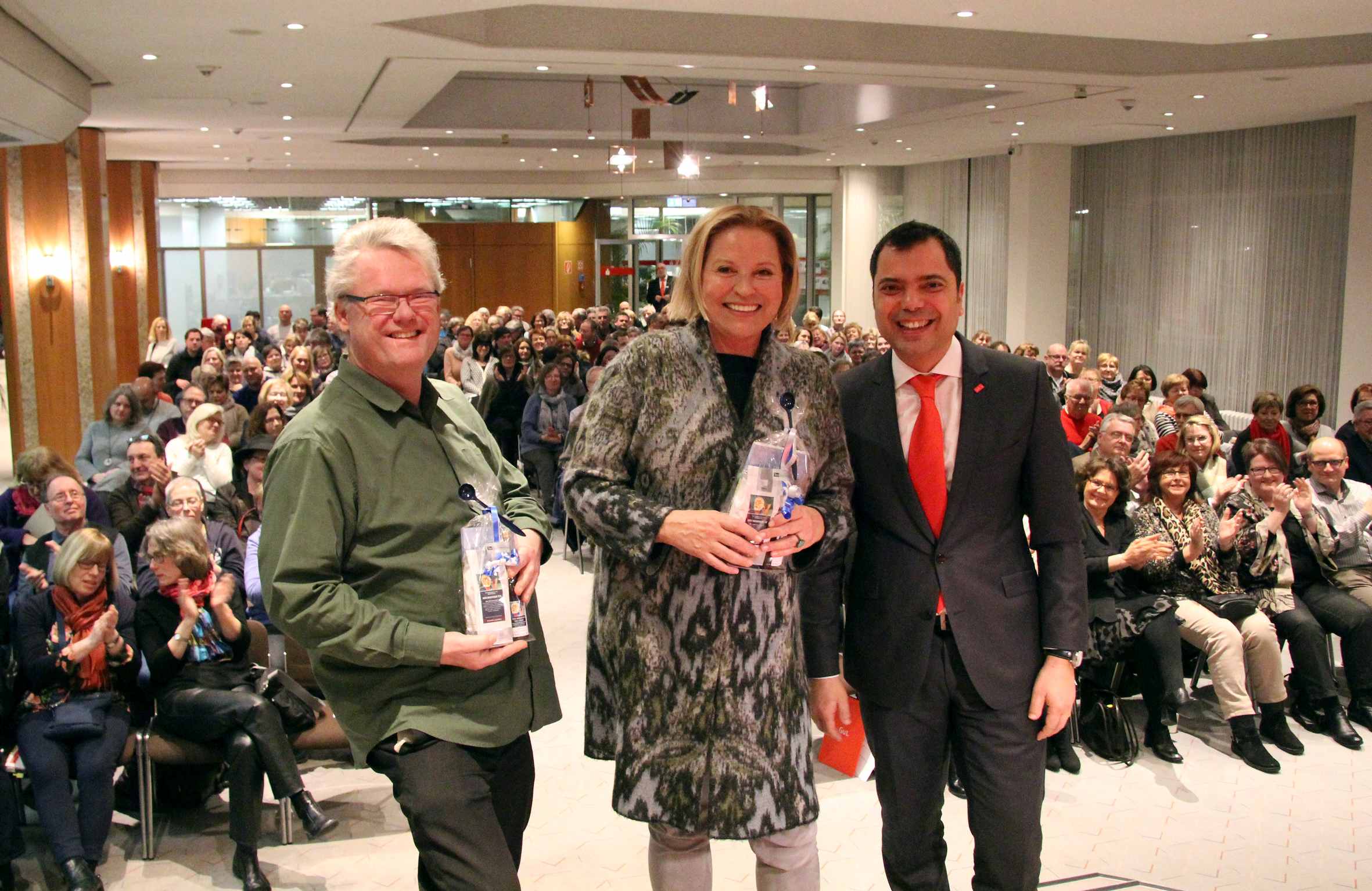 Bestsellerautorin Elisabeth Herrmann, Moderator Stefan Keim (l.) und Sparkassenchef Giovanni Malaponti (r.) genossen die Lesung zum Auftakt des sechsten Krimifestivals Moers. Die 220 Zuhörer in der Kundenhalle der Sparkasse am Niederrhein erlebten einen dynamischen Vortrag, erhielten Einblicke in das Leben der Autorin und erfuhren Wissenswertes aus der Verlagswelt und der Filmbranche.