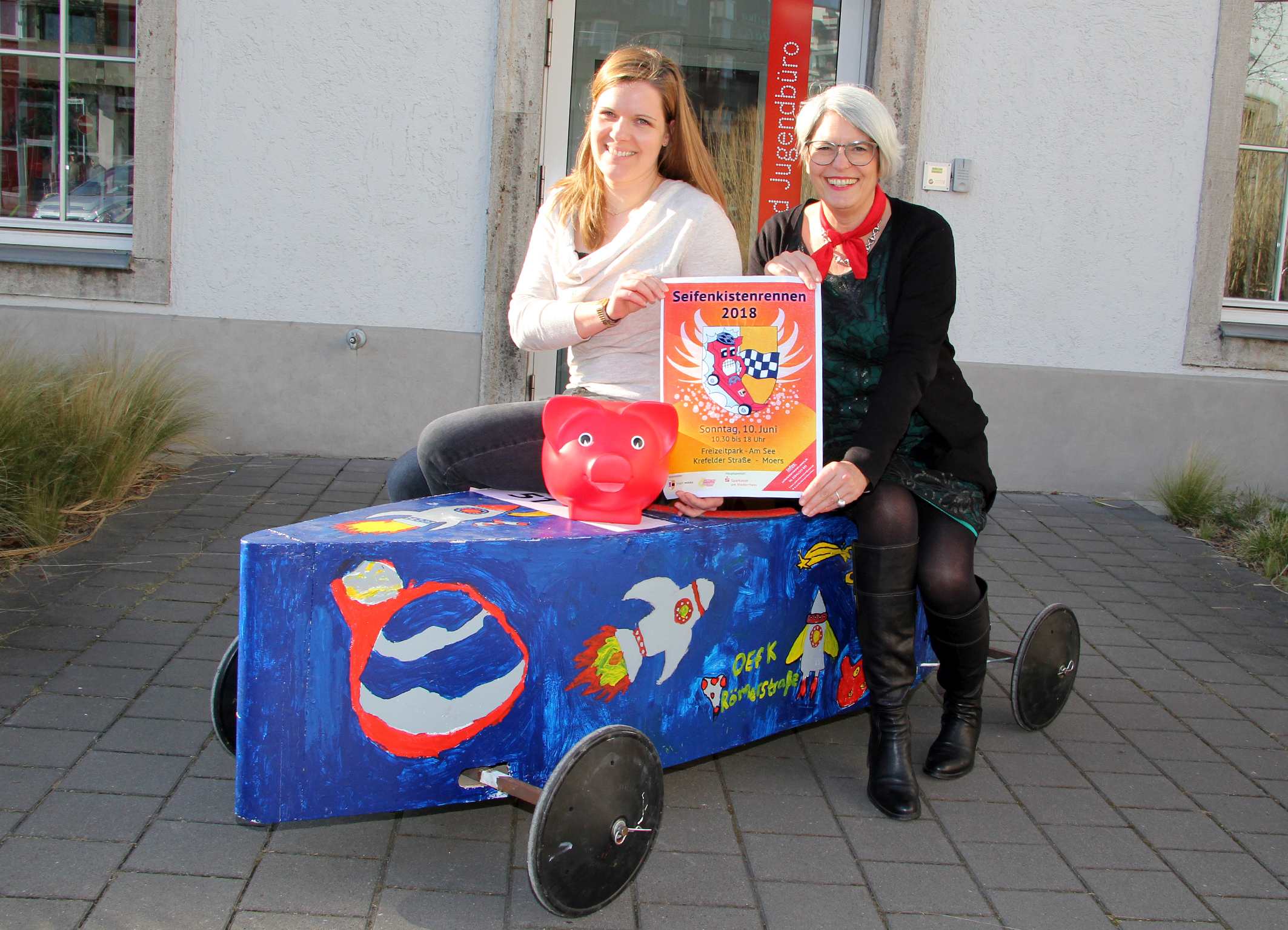 Lena Brandau (Kinder- und Jugendbüro/l.) und Monika Pogacic von der Sparkasse am Niederrhein freuen sich schon jetzt auf das Seifenkistenrennen am 10. Juni im Moerser Freizeitpark.