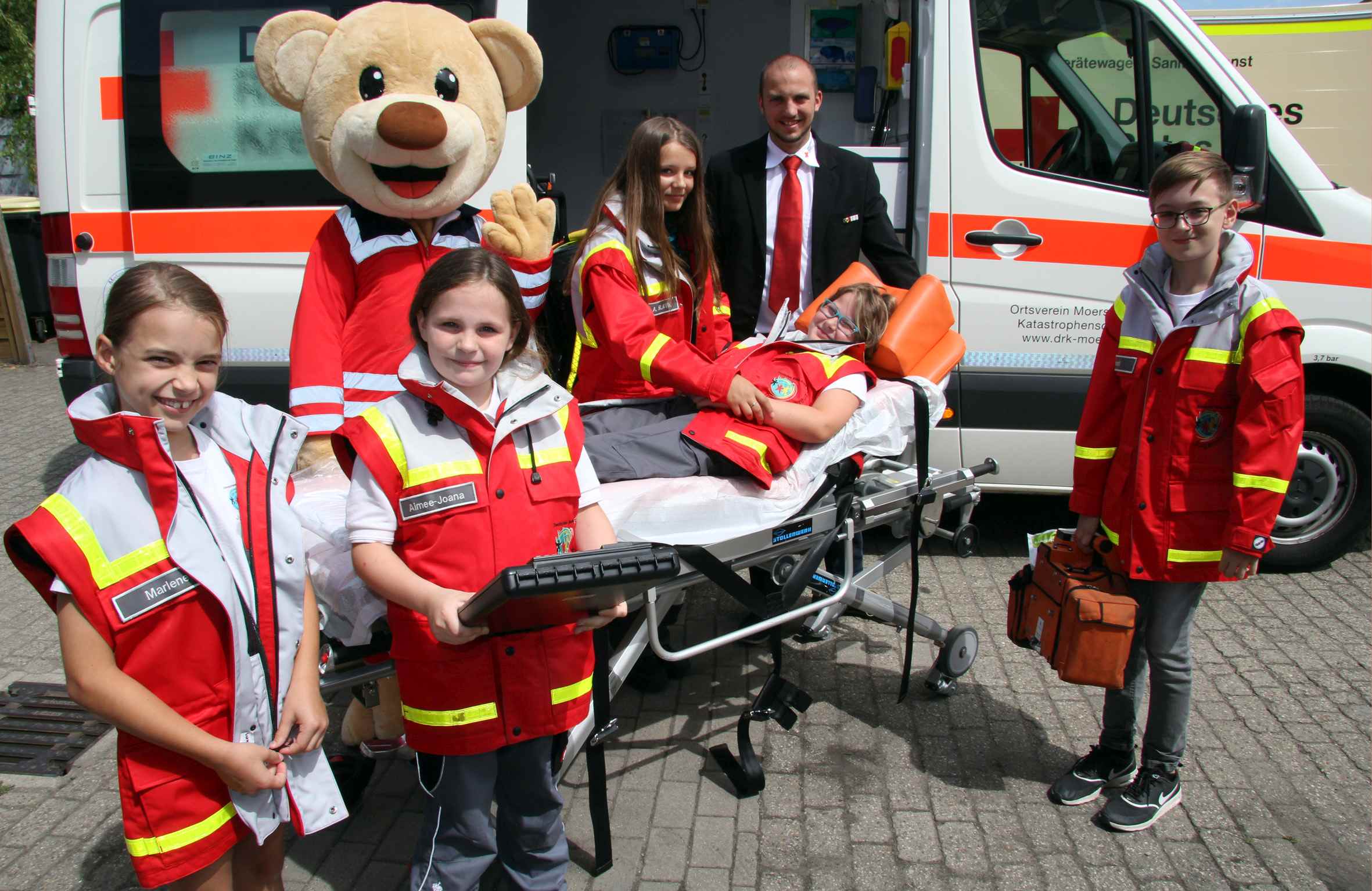 MOERS. Trotz brüllender Hitze ziehen Marlene, Aimee-Joana, Darla und Vincent mit viel Spaß ihre Einsatzjacken an. Schließlich geht es darum, ihren Freund Bruno der Öffentlichkeit vorzustellen. „Bruno ist unserer neues Maskottchen, mit dem wir für unsere Arbeit und um Nachwuchs werben“, sagt Heiko Hennig, Ortsleiter des Jugendrotkreuzes. 125 Jahre gibt es in diesem Jahr das DRK in Moers. Anlässlich des Jubiläums hatte der Jugendleiter für das selbst entworfene Kostüm bei der Sparkasse am Niederrhein um eine Spende gebeten. „Wir sind froh, dass wir diese Unterstützung bekommen haben, denn wir merken schon nach den ersten Auftritten von Bruno, dass mehr Kinder und Jugendliche zu unseren Gruppenstunden kommen“, sagt Heiko Hennig.