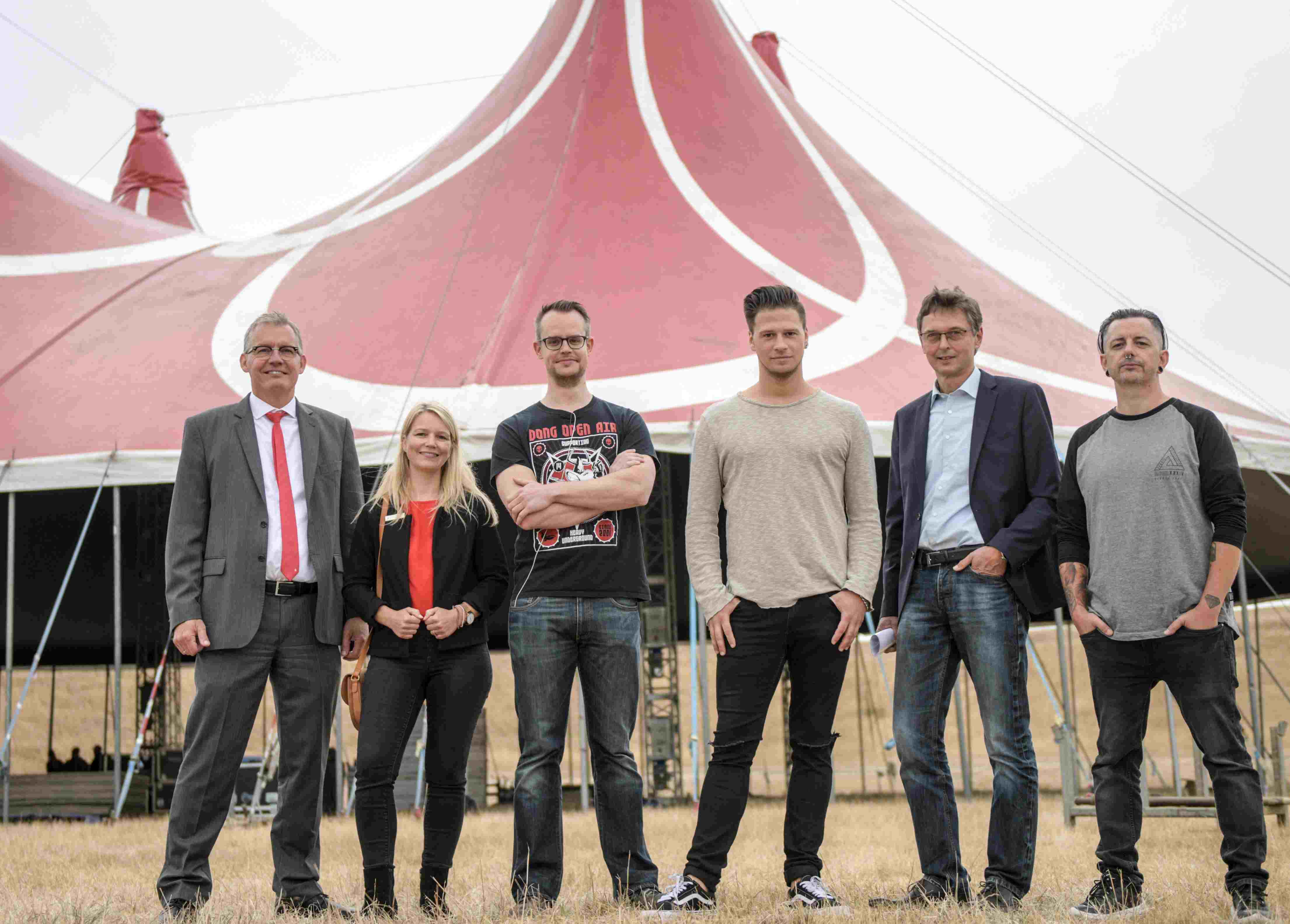 Stellten das Programm von des 18. Dong Open Air vor (v.l.n.r.): Sparkassenvorstand Bernd Zibell, Katrin Steffans, Sparkasse, Stephan Liehr, Organisation, Maik von Betontod, Bürgermeister Harald Lenßen und Ado von Betontod vor dem Festivalzelt auf der Halde Norddeutschland.