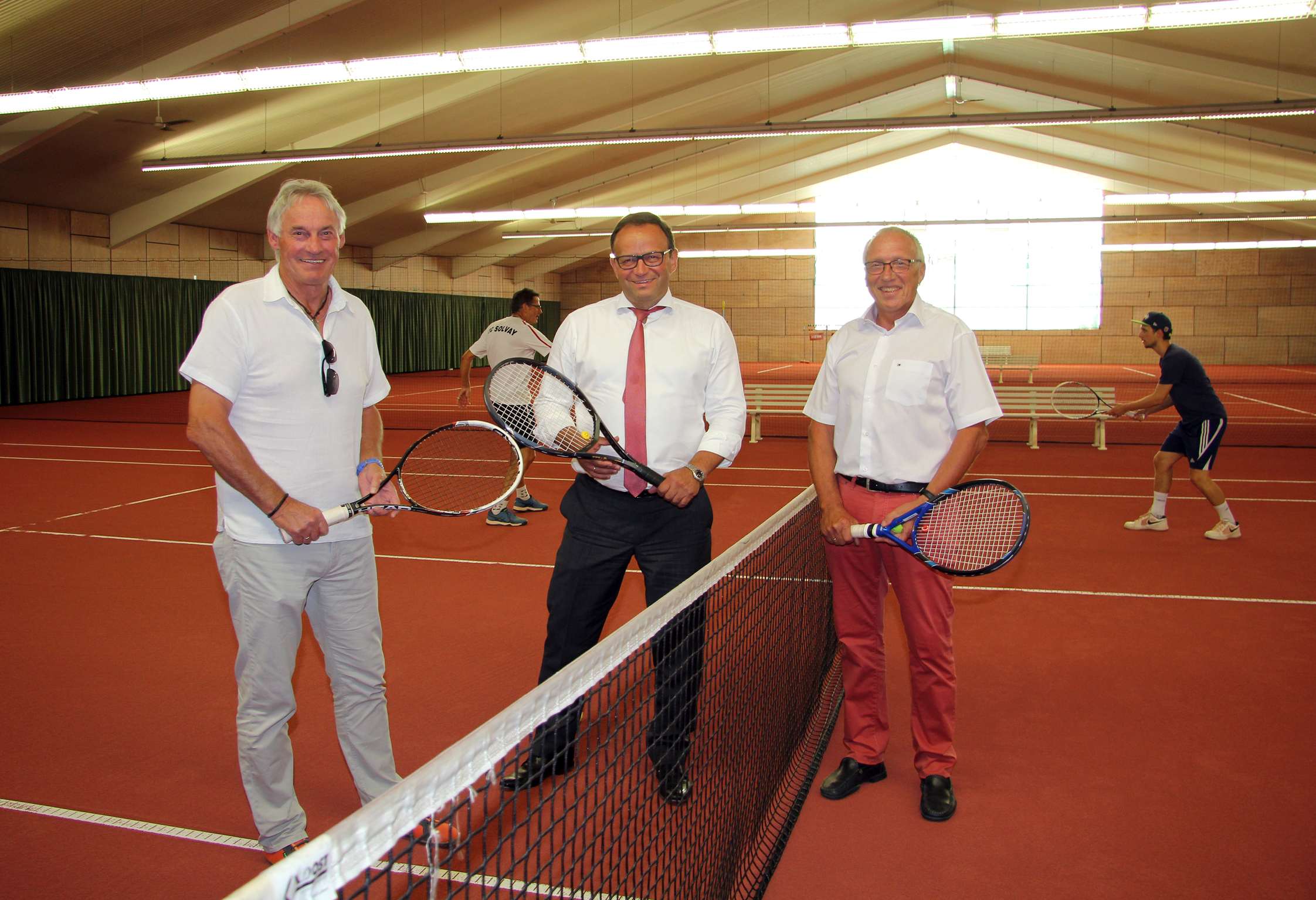 Der beiden Vorsitzenden des TC Solvay Rheinberg, Franz Krekeler (l.) und Manfred Wülfing (r.), zeigten Sparkassendirektor Frank-Rainer Laake den neuen Granulat-Boden. Damit verfügt die Halle des Tennisvereins jetzt über drei topmoderne Plätze, auf denen sich spielen lässt wie auf Sand. Die Plätze können unter www.eversports.de, Stichwort Rheinberg, ganz einfach online gebucht werden.
