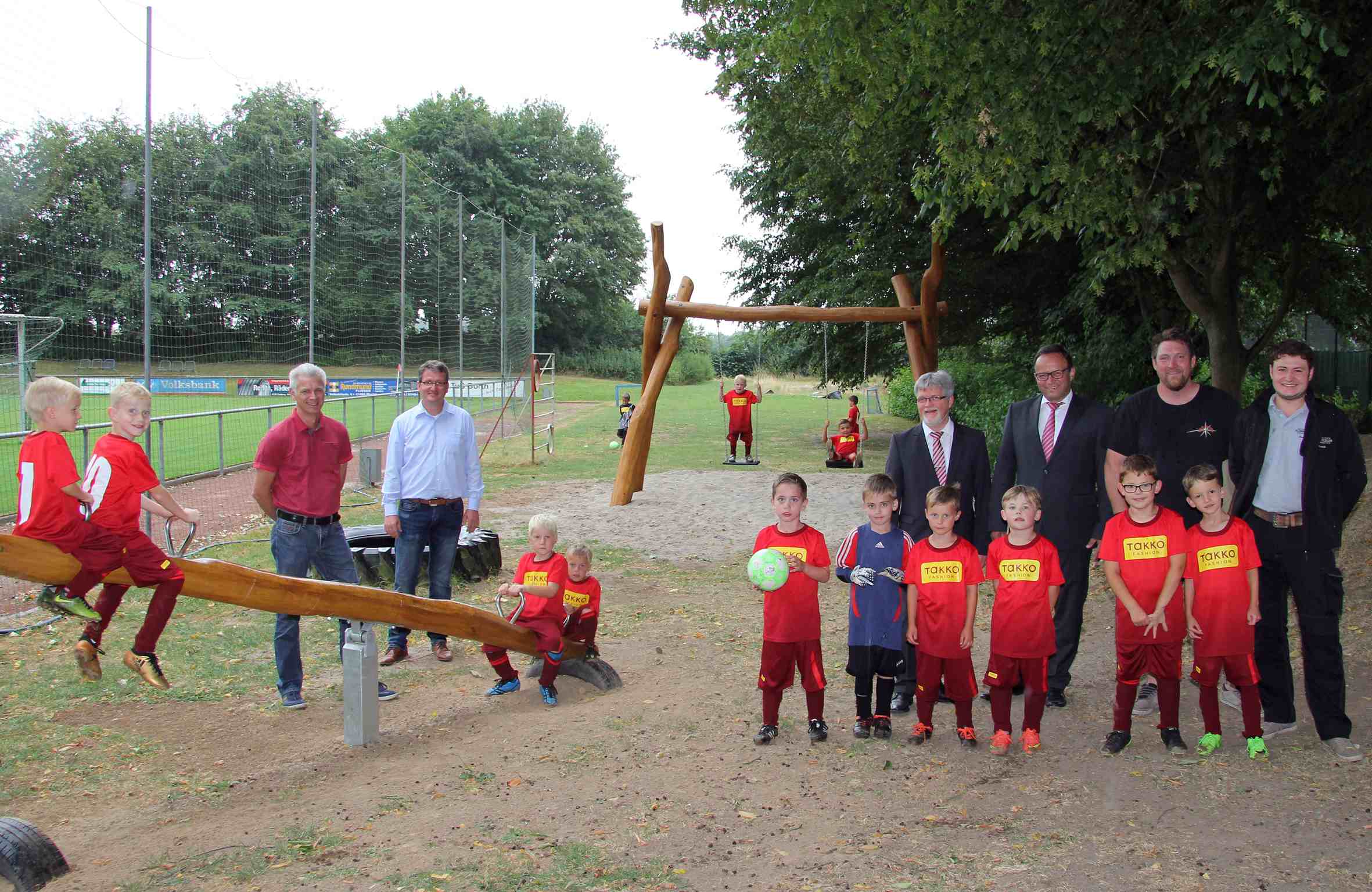 Die jungen Vereinsmitglieder und ihre Geschwister finden die neuen Spielgeräte – Wippe, Schaukel und Kletterturm mit Rutsche (nicht im Bild) – am Vereinsheim des TUS Borth ganz toll. Kassierer Peter Potjans und Vorsitzender Matthias Schmitz (l.) feierten mit Heinz Geßmann und Frank-Rainer Laake von der Sparkasse am Niederrhein sowie Holzbauer Mike Oberhäuser und Sven Florack (r.) die offizielle Einweihung.