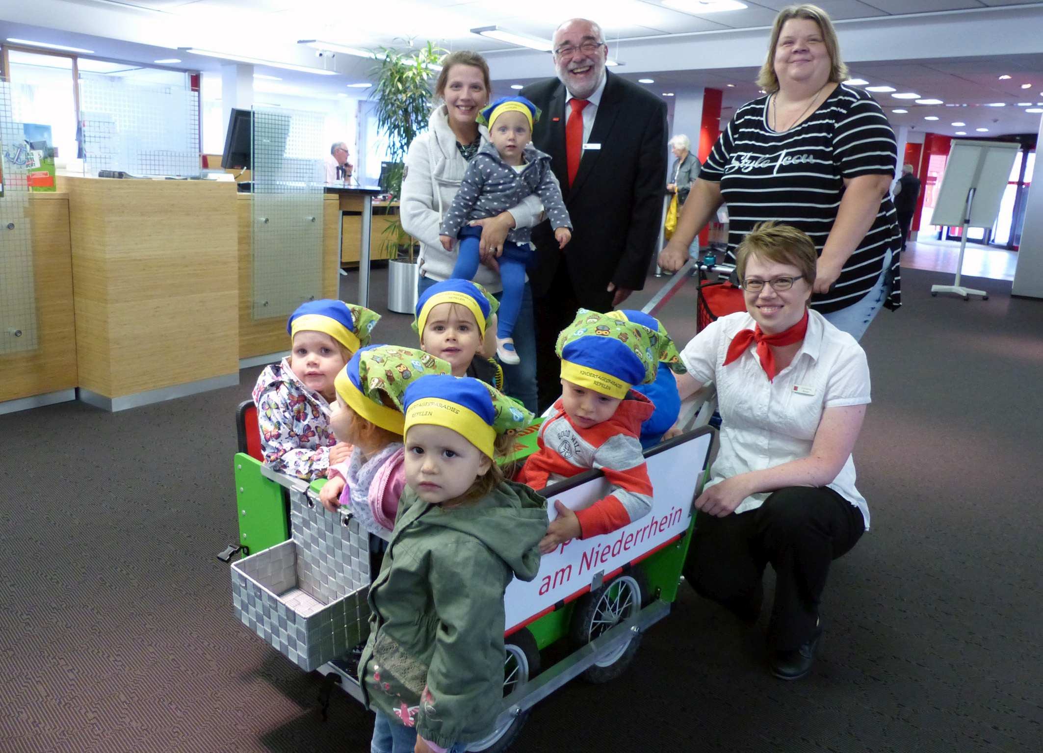 Die Kinder des Kindertagesparadieses machten auf einem ihrer Spaziergänge durch Repelen Station in der Sparkasse und bedankten sich für die Spende und den schönen Bus. Hinten, von links: Sarah Wesoly, Heinz-Josef Rütjes, Stefanie Bräuer und Christina Bauer, die stellvertretende Geschäftsstellenleiterin.