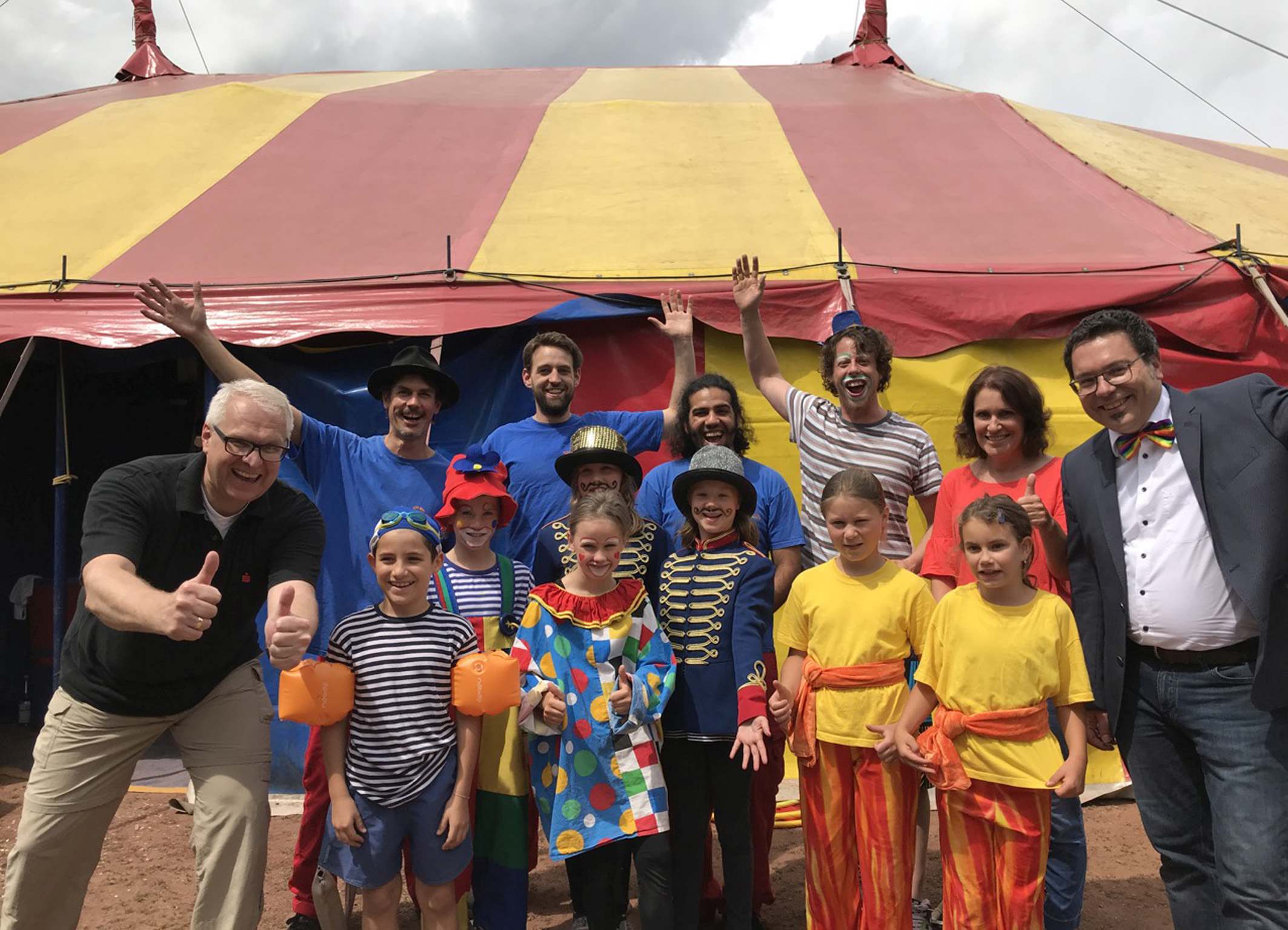 Zirkus- und Schuldirektor René Klaus (ganz rechts) begrüßte mehr als 1300 Gäste in drei Zirkusvorstellungen. Ganz links: Jörg Zimmer, der Vorsitzende des Fördervereins, der in Personalunion für den Hauptsponsor Sparkasse am Niederrhein die Abschlussgala besuchte.