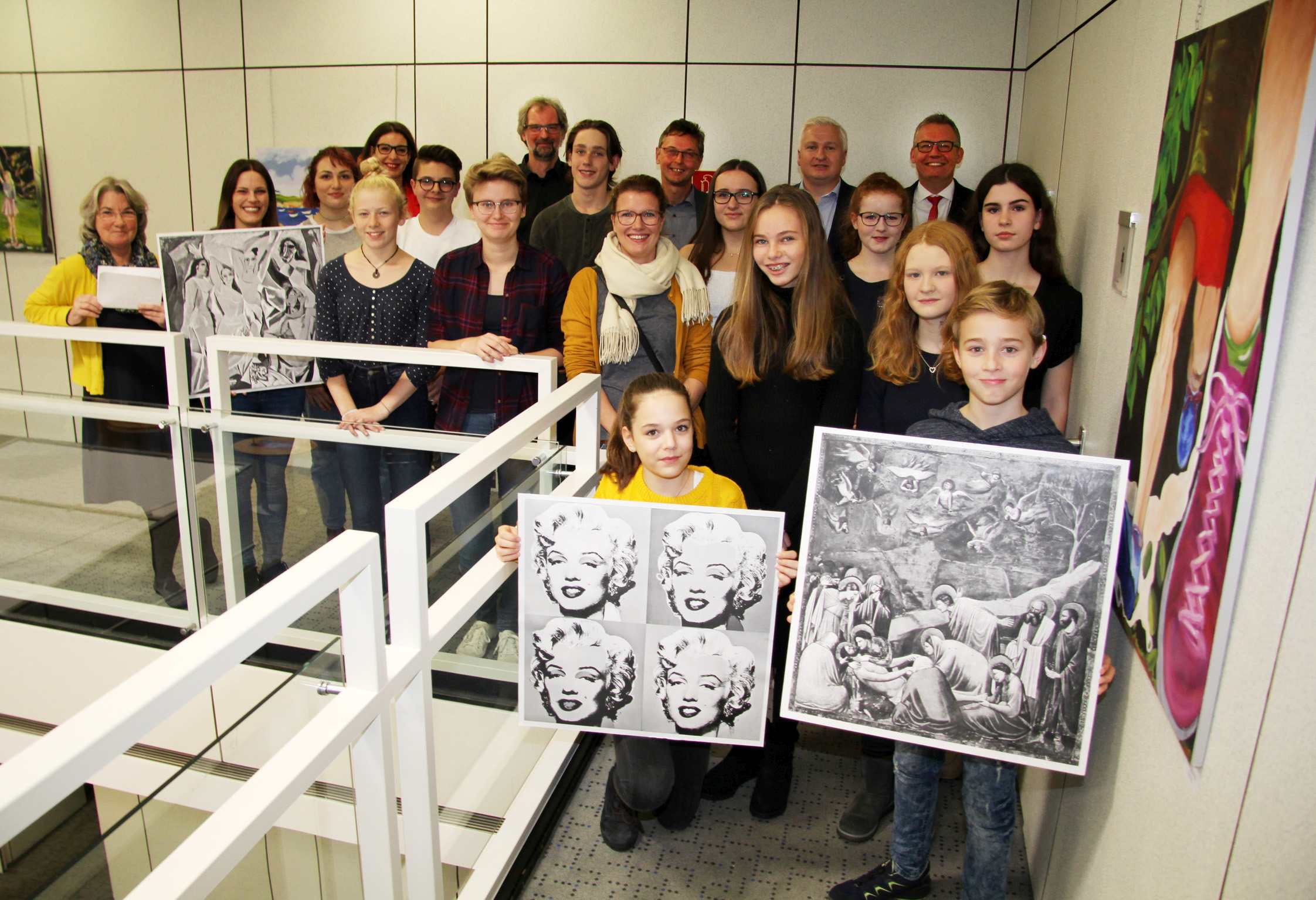 Die Stipendiaten der Kunstschule sowie deren Leiter Gabriele Berndt-Bathen (ganz links) und Gerrit Klein (7.v.l.). freuen sich mit (nach rechts) Bürgermeister Harald Lenßen, Markus Nacke und Bernd Zibell über die Ausstellung „Pop Art“, die noch bis zum 6. Dezember in der Sparkasse an der Poststraße zu sehen ist.