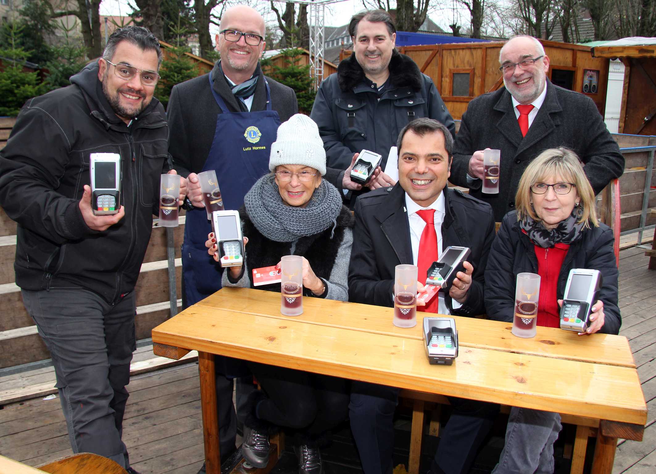 Schausteller und Lionsclubs setzen beim Glühweinverkauf erstmals Bezahlterminals ein (v.l.n.r.): Philip Traber, Lutz Hormes (Lions), Christine Aberfeld, Michael Birr, Giovanni Malaponti, Heiner Rütjes (Sparkasse) und Angelika Krause (Zajunz).