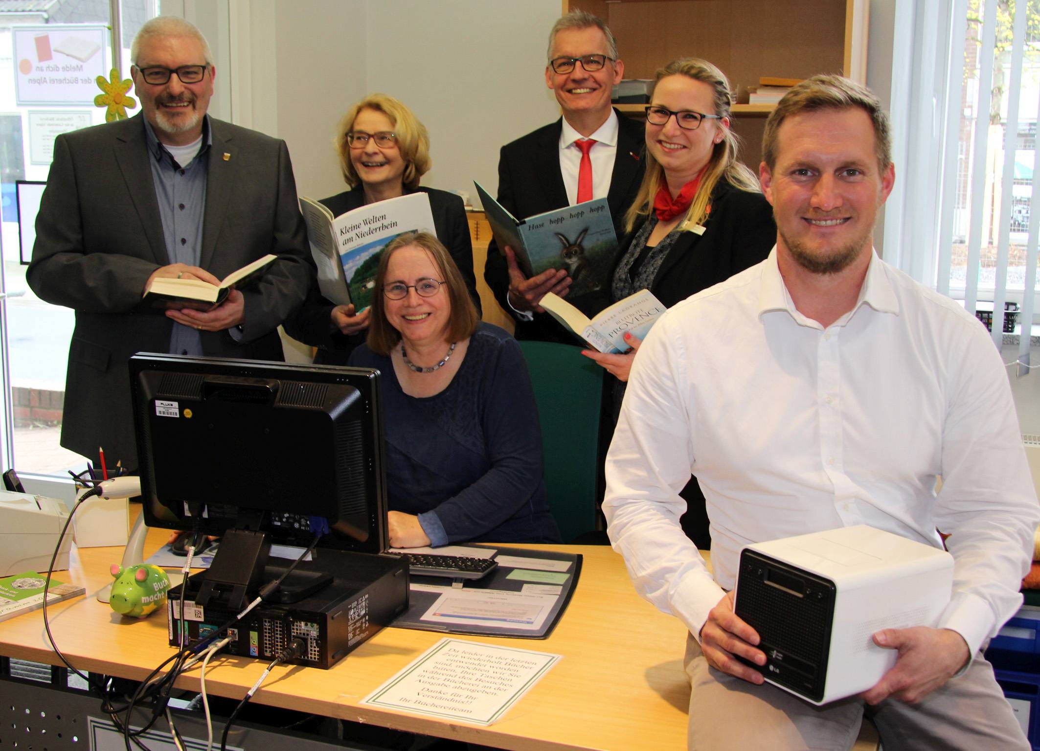 Marco Schinköther, IT-Spezialist der Gemeinde Alpen, (rechts vorne) installierte die neue Speicherbox der Bücherei. Anlässlich der Inbetriebnahme luden (v.l.n.r.) André Emmerichs und Kerstin Pieper Sparkassenvorstand Bernd Zibell und Geschäftsstellenleiterin Kathrin Hüsch zum Besuch ein. Am PC: Mechthild Heining, eine von 25 Ehrenamtlichen des Bücherei-Teams.