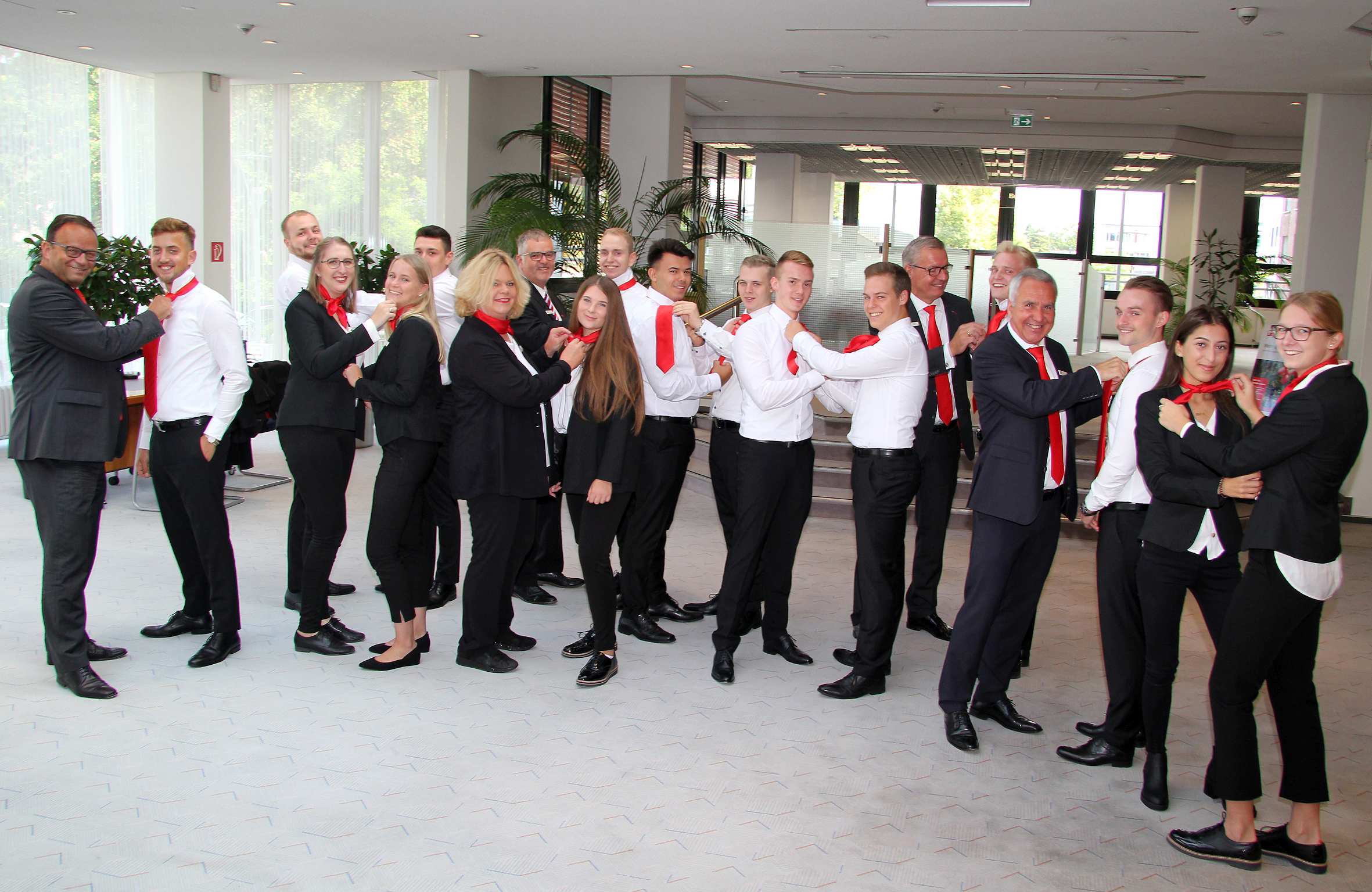 Erste Aufgabe im Team für die neuen Auszubildenden der Sparkasse am Niederrhein: Krawatten und Tücher binden. Die Vorstände Bernd Zibell (6.v.r.) und Frank-Rainer Laake (ganz links) sowie Personalchef Jürgen Renner (4.v.r.) und Ausbilderin Sabine Lucas (7.v.l.) assistierten.