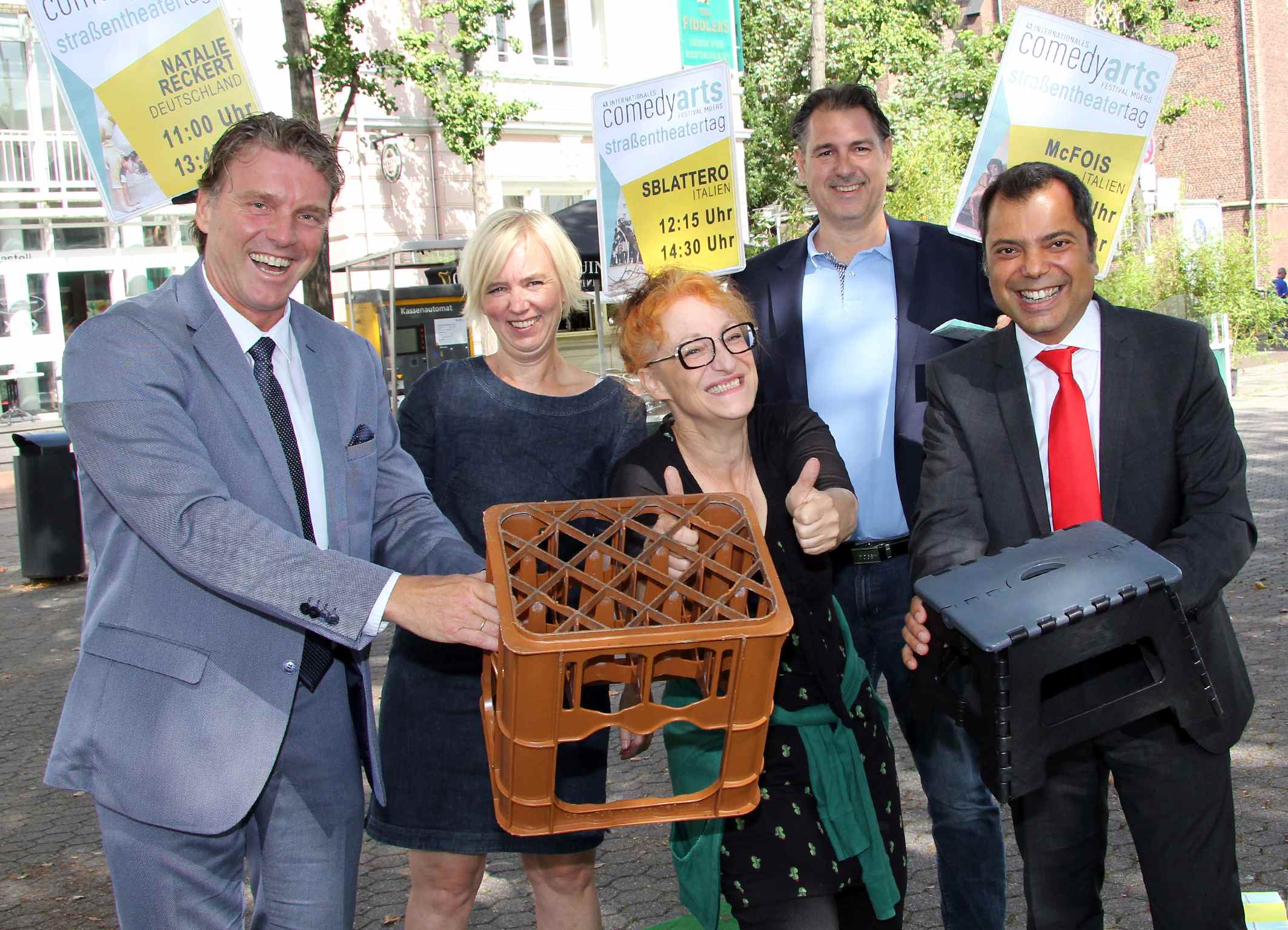 Guter Tipp für den ComedyArts-Straßentheatertag am Samstag, 24. August, in Moers: etwas zum Draufstehen mitbringen! V.l.n.r.: Bürgermeister Christoph Fleischhauer, Katja Roters, die künstlerische Leiterin Betti Ixkes, Michael Birr und Sparkassenchef Giovanni Malaponti.