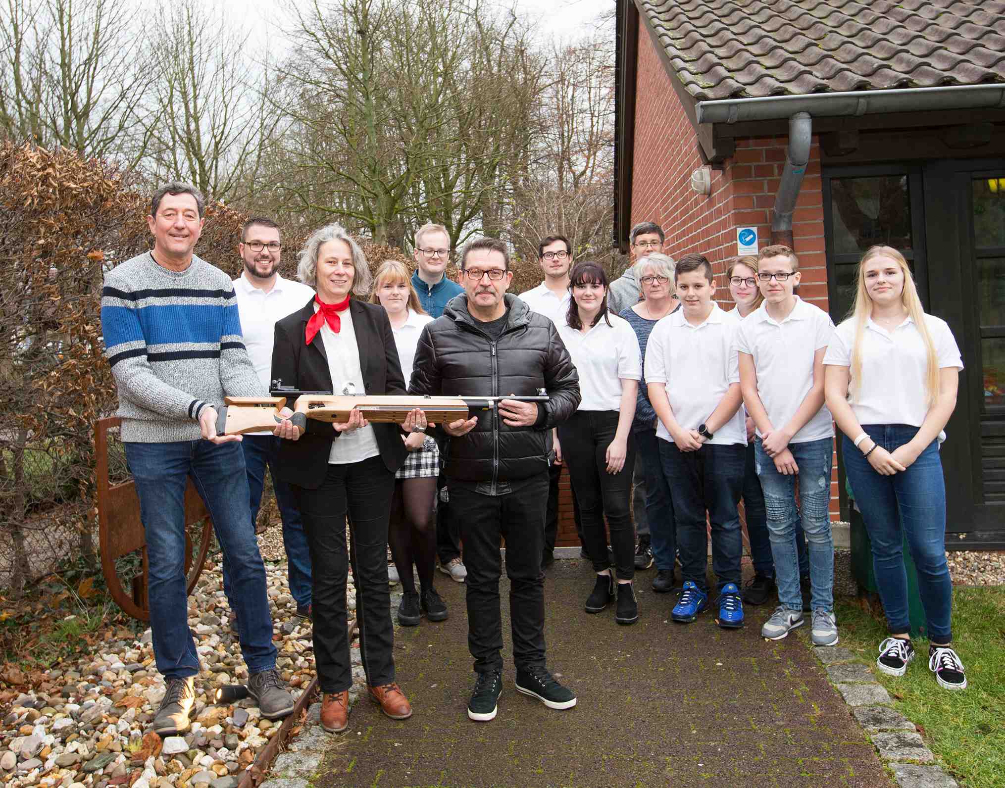RHEINBERG. Für Links- und Rechtshänder gleichermaßen geeignet ist das neue Luftgewehr, dass sich die St.-Michaelis-Schützenbruderschaft Dank der 1.000-Euro-Spende von der Sparkasse am Niederrhein kaufen konnte. „Das gute Stück hat einen Universalschaft“, sagt Brudermeister Heinz Terschlüsen (l.) und zeigt Geschäftsstellenleiterin Andrea Kabs-Schlusen (Mitte) den aus Nussbaum gefertigten Teil des Sportgeräts. Schießmeister Roland Dorawa (r.) erklärt weitere Vorzüge des Gewehrs, beispielsweise das erschütterungsfreie Pressluft-System. Über das neue Luftgewehr freuen sich auch die Jungschützinnen und -schützen.