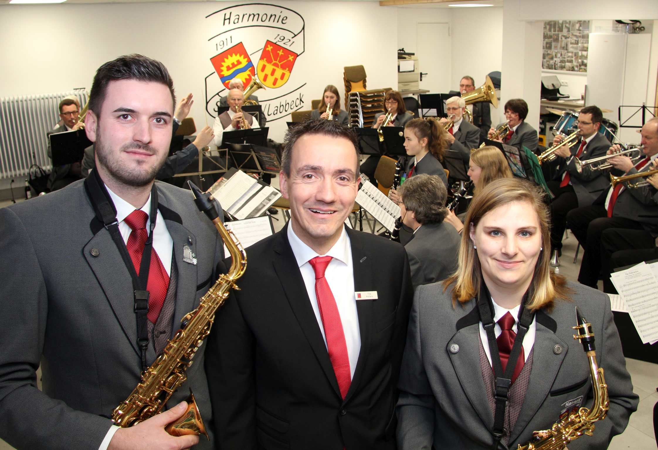Normalerweise proben die Mitglieder des Musikvereins Harmonie nicht in ihren Uniformen. Doch für den Besuch von Geschäftsstellenleiter Tim Rütter hatten sich Georg Ingenlath (l.), Daniela Bongarts (r.) und die anderen in Schale geworfen.