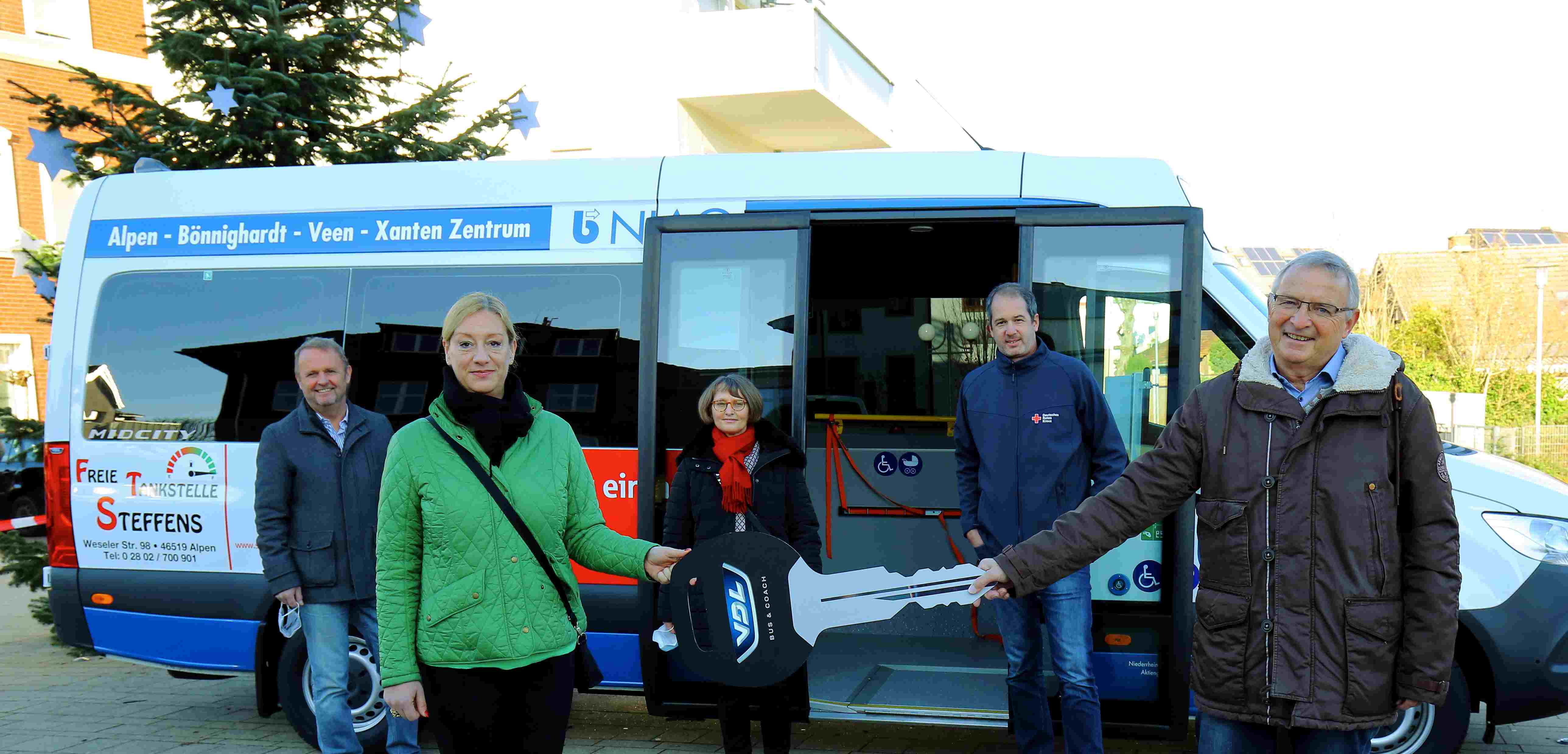 Übergabe des neuen Bürgerbusses am Rathausplatz in Alpen. Vorne: Astrid Kutscha von der NIAG übergibt den Schlüssel an Josef van Beek, den Vorsitzenden des Bürgerbusvereins. Hinten (v.l.) Bürgermeister Thomas Ahls, Heike Letschert von der Sparkasse am Niederrhein und Jan Höpfner, Vorstand des DRK Kreisverbandes Niederrhein.