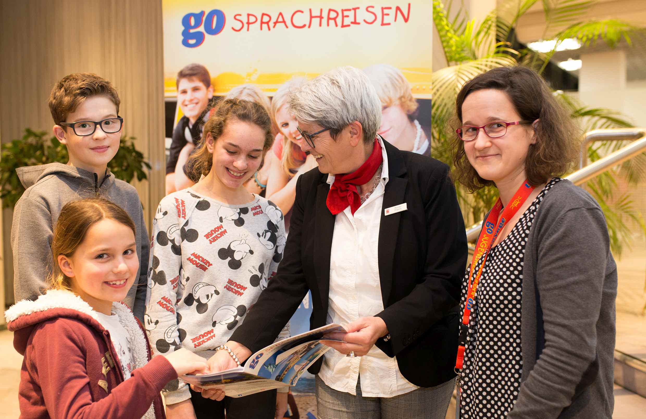 Für Till und Lina (hinten, von links) steht fest, dass sie in diesem Jahr eine Sprachreise machen wollen. Vorne: Linas Schwesterchen Karolin mit Monika Pogacic von der Sparkasse und (ganz rechts) Alexandra Funke vom Reiseunternehmen Voyage.