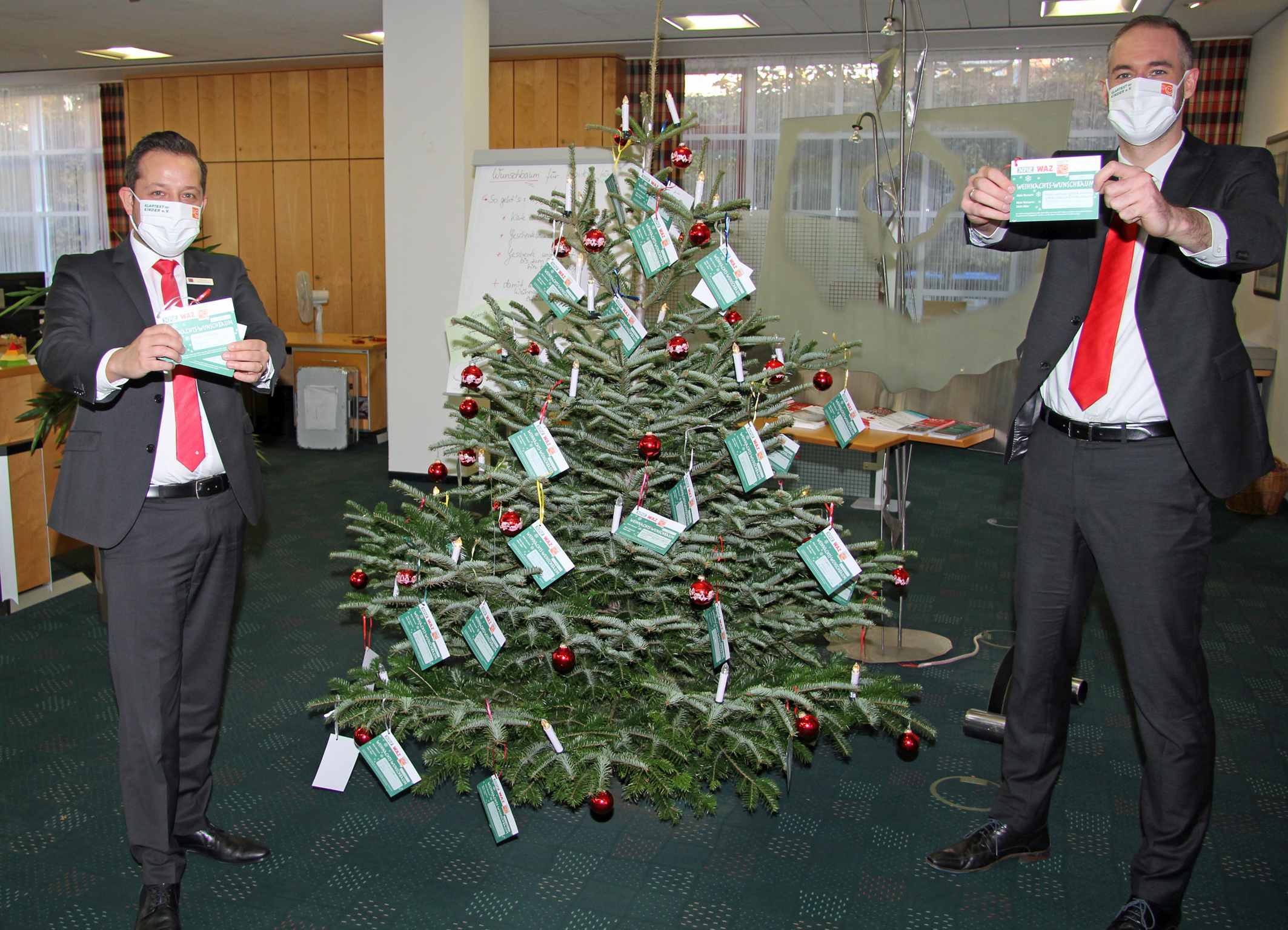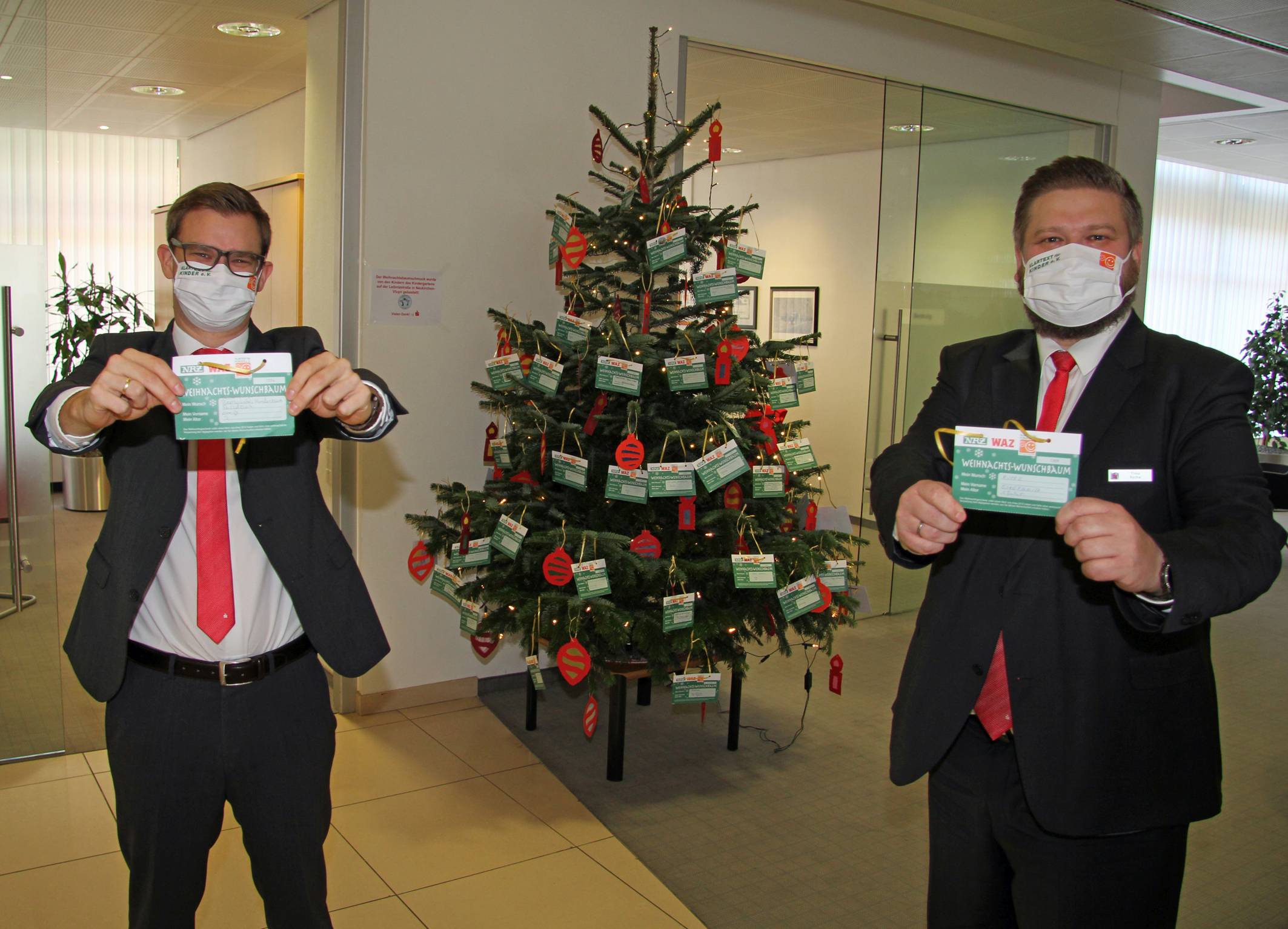 Markus Schürmann, Leiter der Geschäftsstelle in Moers Asberg, und sein Kollege Nino Janoscheck waren verblüfft, wie gut der Wunschbaum gleich zum Start angenommen wurde. Auch dort steht erstmals ein Wunschbaum mit 60 Karten und auch dort fragten die Kunden schon vor einigen Tagen nach. In allen Geschäftsstellen liegen zudem Mund-Nase-Stoffmasken mit dem Vereinslogo von Klartext. Daneben steht jeweils eine Spardose. „Die Masken können in jedem Fall gern mitgenommen werden, eine kleine Spende ist kein Muss, aber natürlich würden wir uns freuen“, so Michael Passon vom Verein Klartext für Kinder. Markus Schürmann: „Ein Kunde hat, kaum stand die Dose, 50 Euro eingeworfen und trotzdem keine Maske genommen. Die Arbeit des Vereins Klartext für Kinder wird hier sehr geschätzt.“