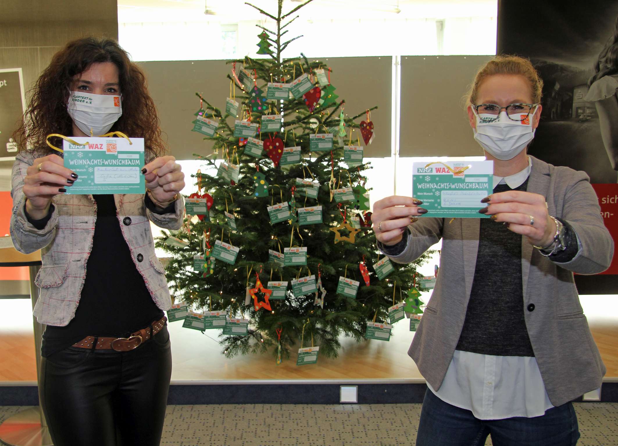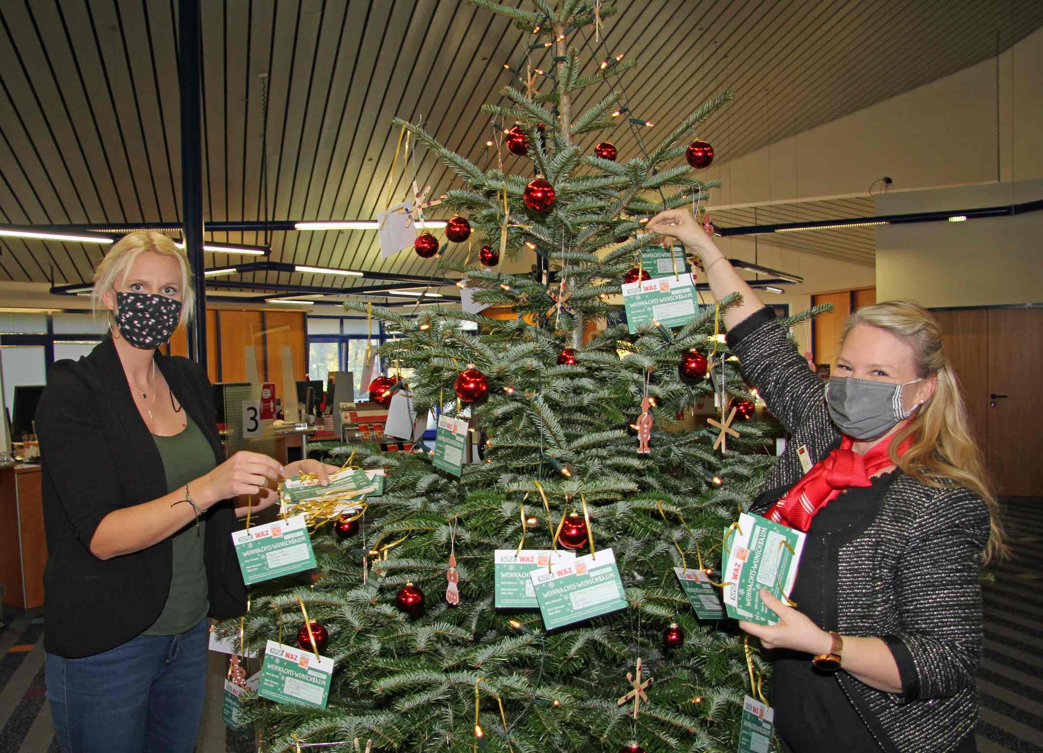 Ebenfalls erstmals dabei ist die Geschäftsstelle am Bendschenweg in Neukirchen-Vluyn. „Wir freuen uns sehr, dass wir gerade jetzt in dieser Zeit, wo so vieles nicht sattfinden kann, diese besondere Aktion von Klartext für Kinder unterstützen dürfen“, sagt Geschäftsstellenleiterin Sara Deckers. Mit ihrem Team hatte sie den Baum bereits fertig geschmückt, als Teresa Rasche vom Kreisjugendamt mit den Wunschkarten kam. "In jeder der drei Neukirchen-Vluyner Geschäftsstellen hängen nun zunächst je 80 Karten“, so Teresa Rasche. Es werden aber wohl noch welche dazukommen, sagt die Mitarbeiterin des Kreises.